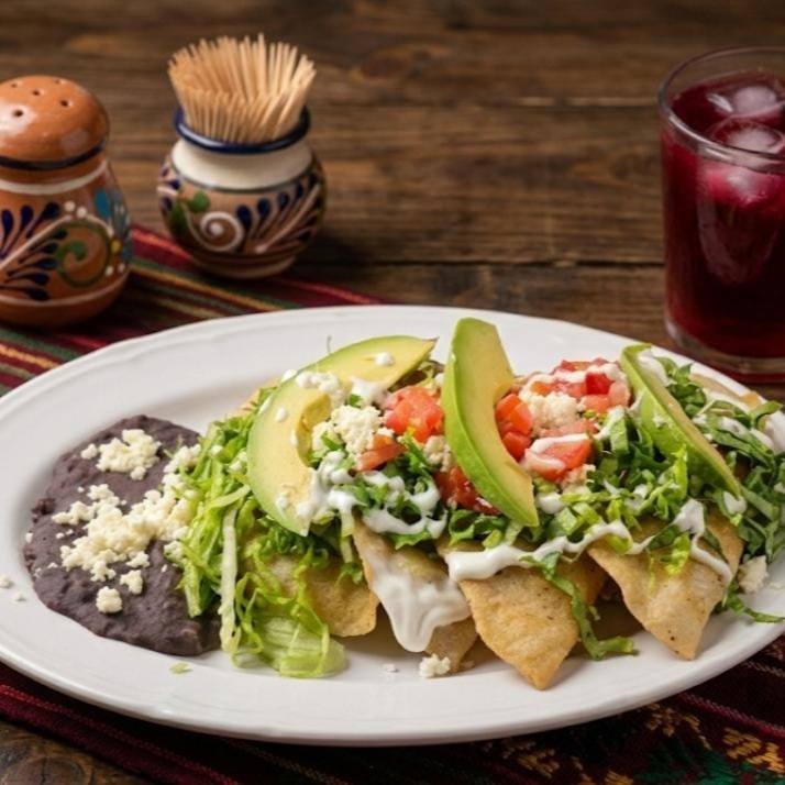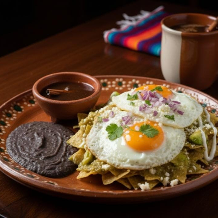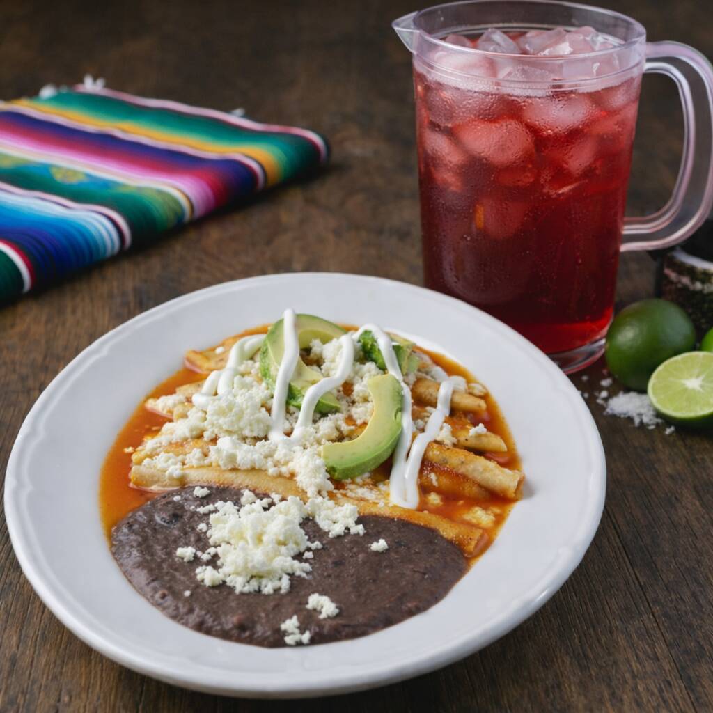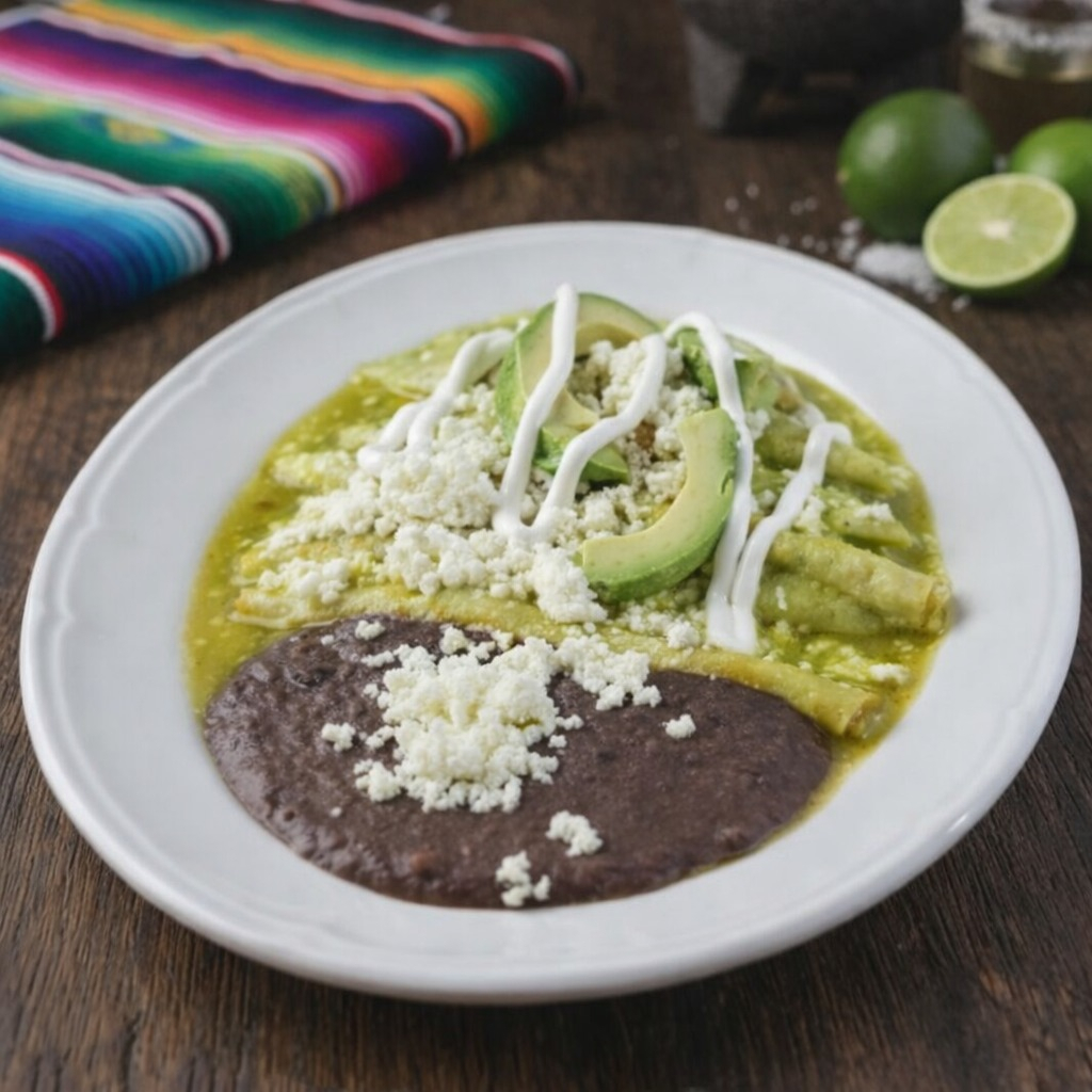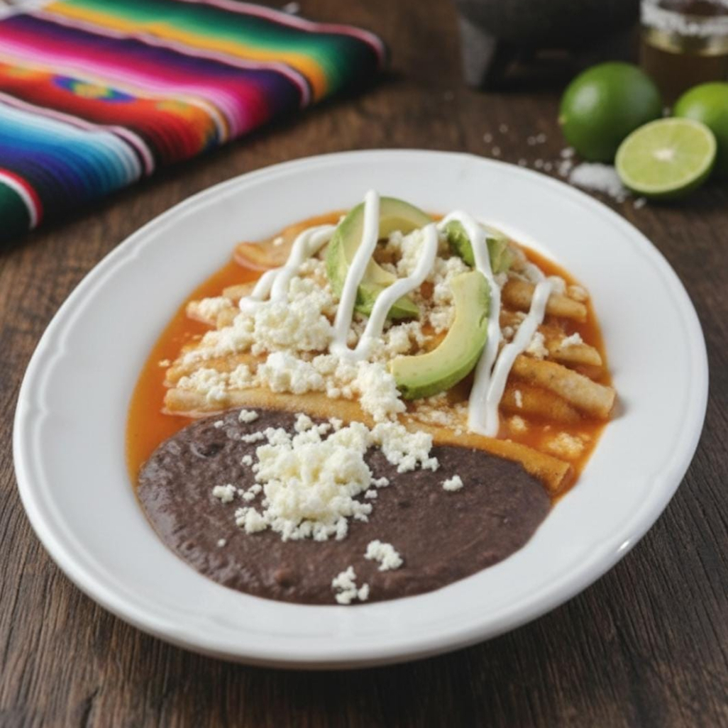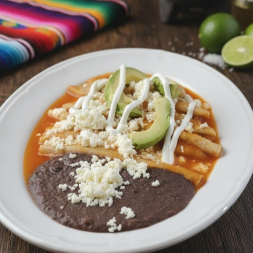 Tortillas de maíz bañadas en salsa casera de jitomate 🍅, con aguacate con queso fresco y crema 🧀. Acompañadas de frijoles refritos, son un platillo tradicional, ligero y lleno de auténtico sabor mexicano