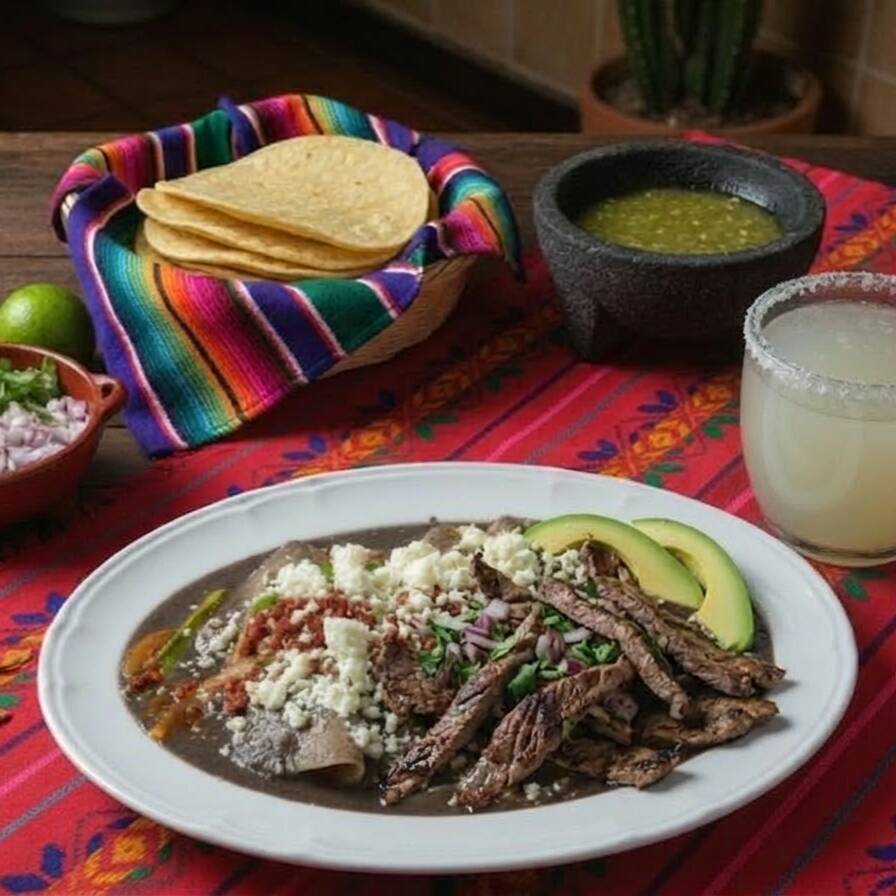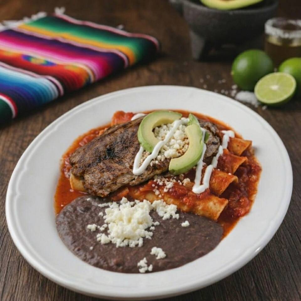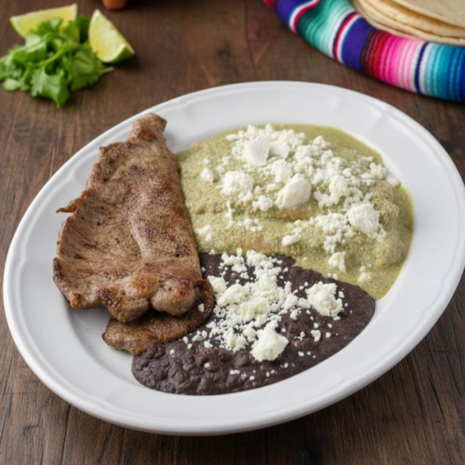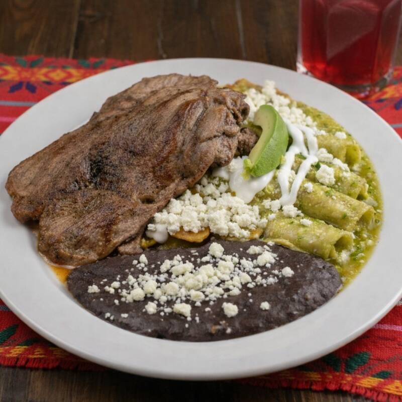 Tortillas de maíz recién hechas bañadas en salsa casera de tomate 🍅,acompañadas con jugoso bistec de 100g a la plancha 🥩, con aguacate, cubiertas de queso fresco y crema 🧀. Servidas con frijoles refritos, son una opción tradicional, abundante y llena de auténtico sabor mexicano