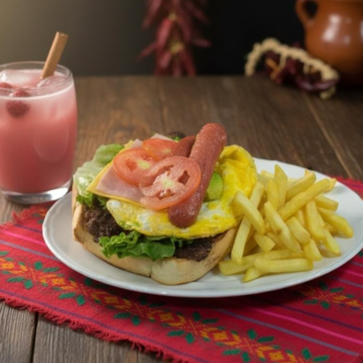 Hamburguesa especial Don Benito con doble carne, jamón, tocino, salchicha, lechuga fresca y tomate, preparada en pan suave 🍔🥓🌭. Acompañada de papas francesas , es un antojo abundante y lleno de sabor. 🍟✨
