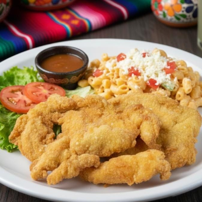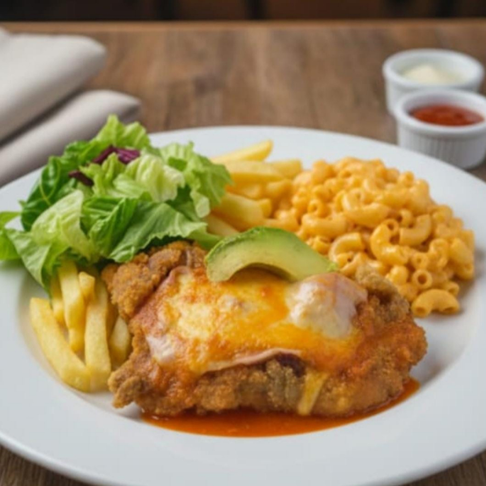 Milanesa de pollo o res crujiente, acompañada de ensalada fresca, papas francesas y pasta 🥗🥔🍝. Un platillo completo, casero y lleno de sabor. 😋