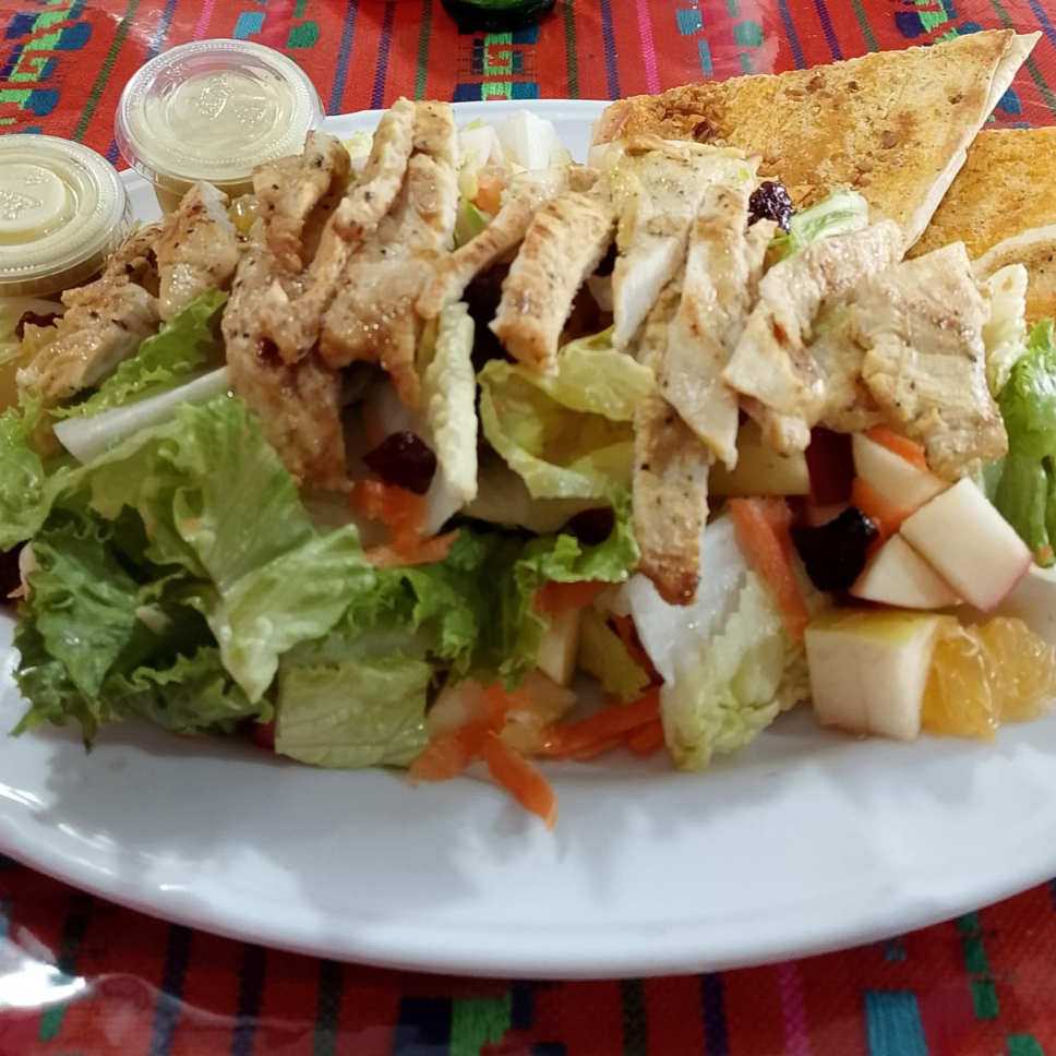 Pechuga Asada con Lechuga ala Plancha 🥬 en cuadros con manzana,arándanos 🫐, zanahoria 🥕, naranja 🍊, acompañado de aderezo de ajonjolí, acompañado de crotones de pan de ajo