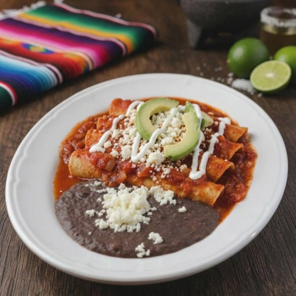 Enchiladas tradicionales bañadas en salsa roja casera, con aguacate y acompañadas de frijoles refritos, espolvoreadas con queso fresco. 🧀 Un clásico mexicano lleno de sabor y perfecto para cualquier antojo.