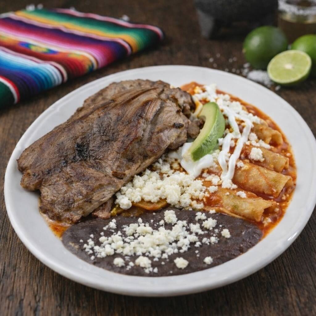 Enchiladas bañadas en salsa roja casera, acompañadas de jugoso bistec de 100g servido por un lado, con aguacate, frijoles refritos y queso fresco. 🥩🧀 Un platillo completo y lleno de sabor para disfrutar al máximo.