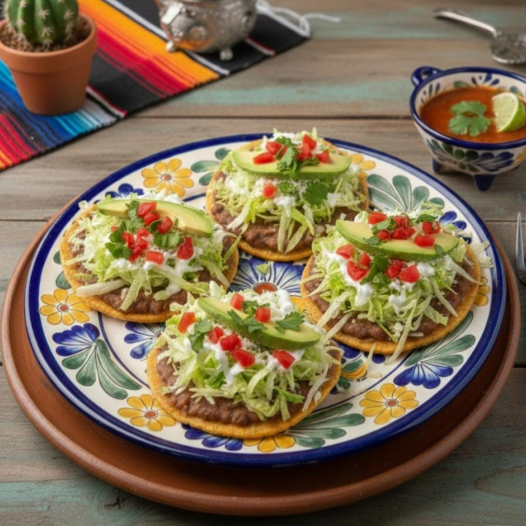 Sopes recién hechos con base de frijoles refritos con pollo encima, lechuga fresca, queso, crema y aguacate 🥑, llenos de sabor y tradición mexicana 🌮😋.