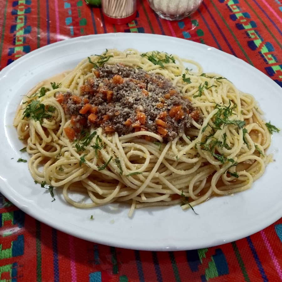 Spaghetti a la mantequilla con carne ala Boloñesa,espolvoreada con queso parmesano acompañado con pan francés dorado