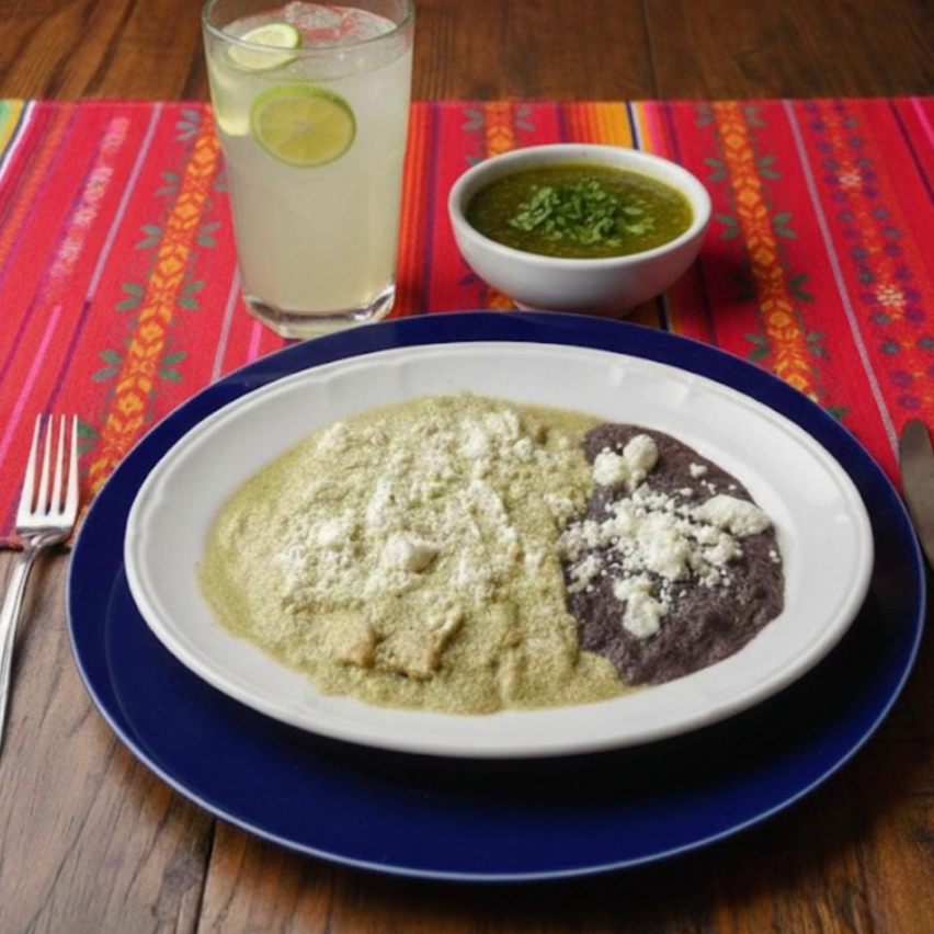 Tortillas bañadas en salsa verde de tomatillo, ligeramente ácida y llena de sabor, con aguacate, con queso fresco y deliciosa crema. Acompañadas de frijoles refritos. Un clásico mexicano fresco y delicioso. 🌿🧀