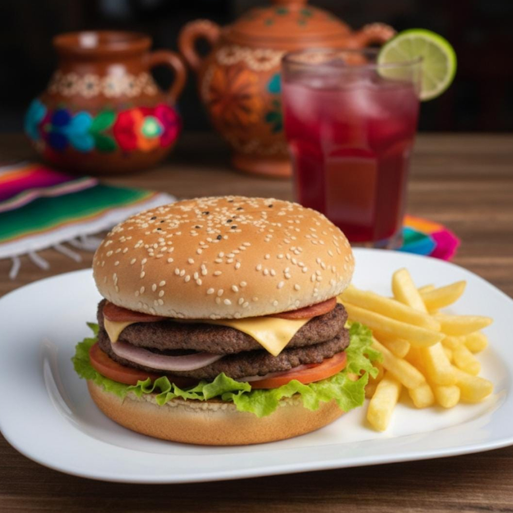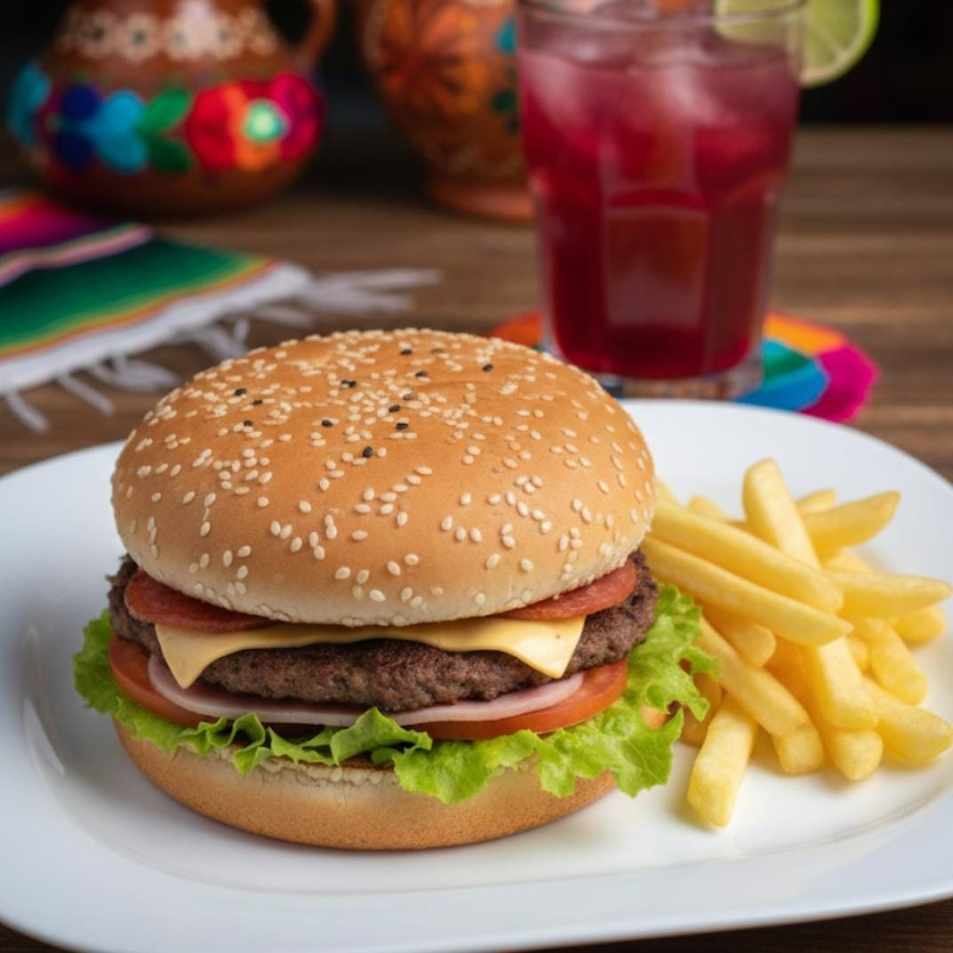 Hamburguesa sencilla preparada con jugosa carne, queso americano, jamón, tomate y cebolla en pan suave 🧀🍅🍔. Un clásico delicioso y lleno de sabor en cada bocado. 😋✨