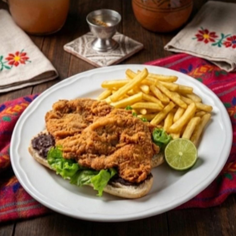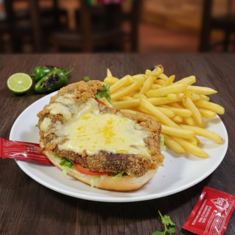 Torta especial de milanesa con queso gratinado, preparada con lechuga fresca, tomate, aguacate y crema junto con unas crujientes papas fritas 🥑🧀🥬. Un antojo abundante y lleno de sabor en cada bocado. 😋