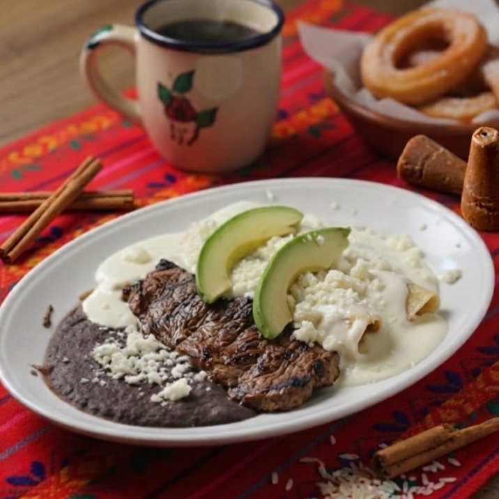 Encremadas suaves bañadas en salsa de crema, con aguacate, cubiertas con queso fresco 🧀🥛🌮. Acompañadas de frijoles refritos y jugoso bistec de 100g a la plancha 🥩, son un platillo tradicional lleno de auténtico sabor casero. ✨