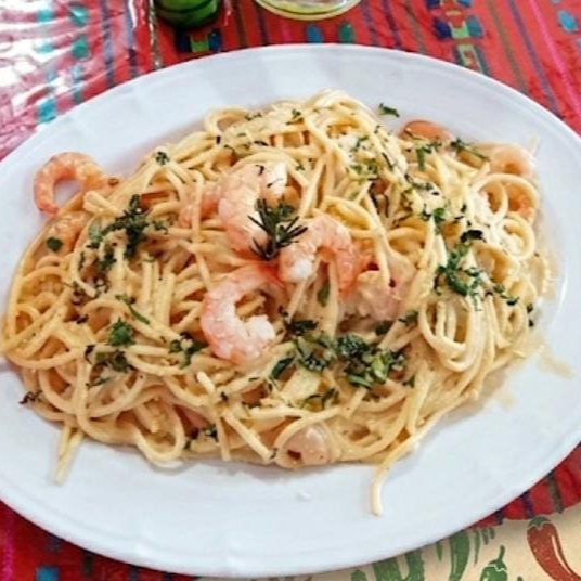 Pasta a la mantequilla y camarones bañados con crema de chipotle ,espolvoreada con queso parmesano y cilantro, acompañado con pan francés dorado
