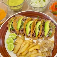 Taco en tortilla de maiz taquera con carne al pastor acompañado de papas