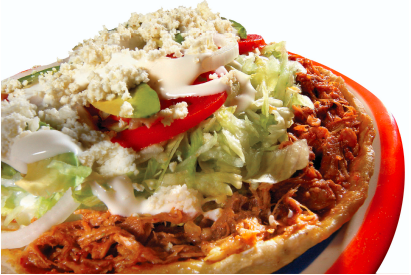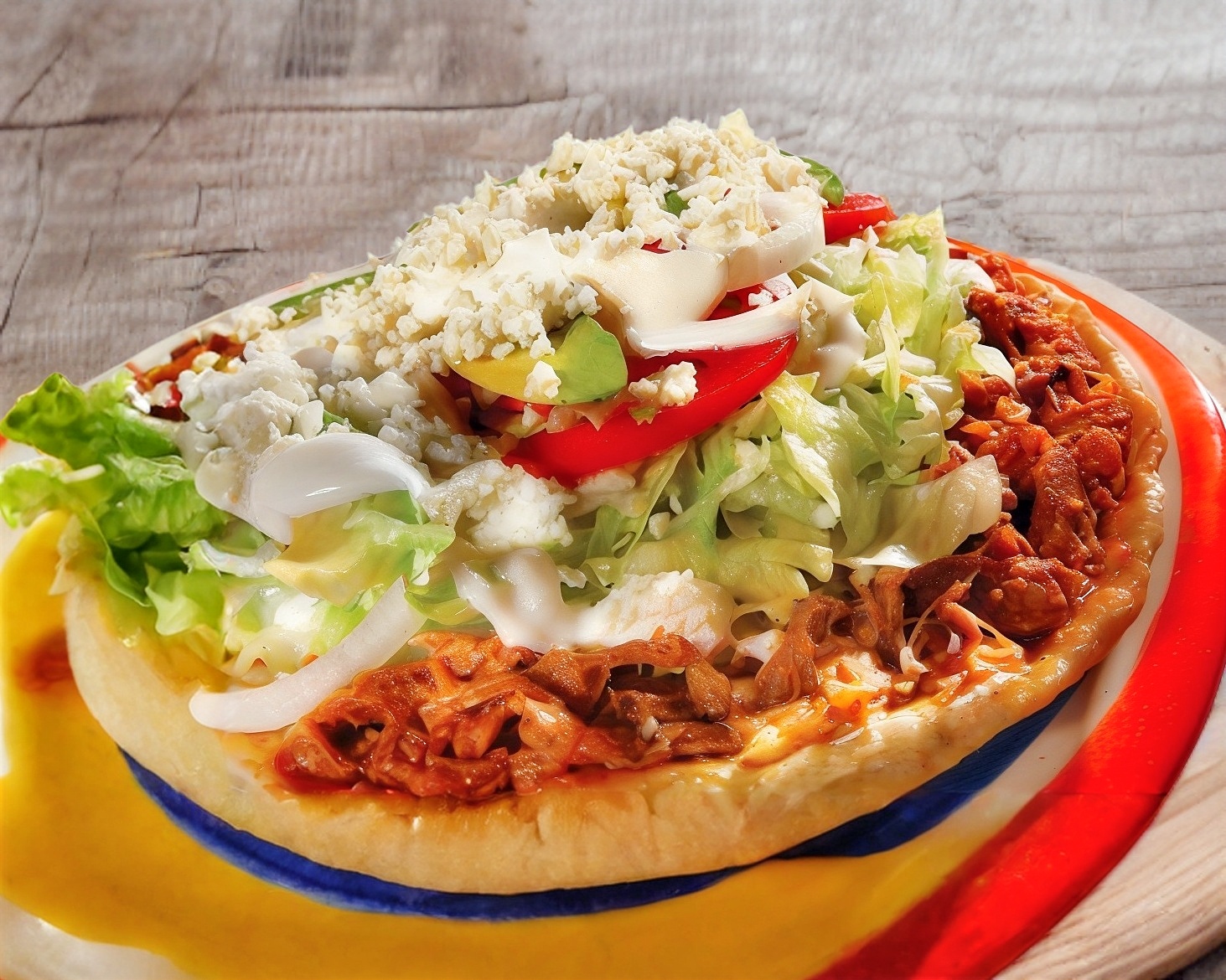 Frijoles refritos, carne deshebrada de res, tómate, aguacate, crema y queso fresco