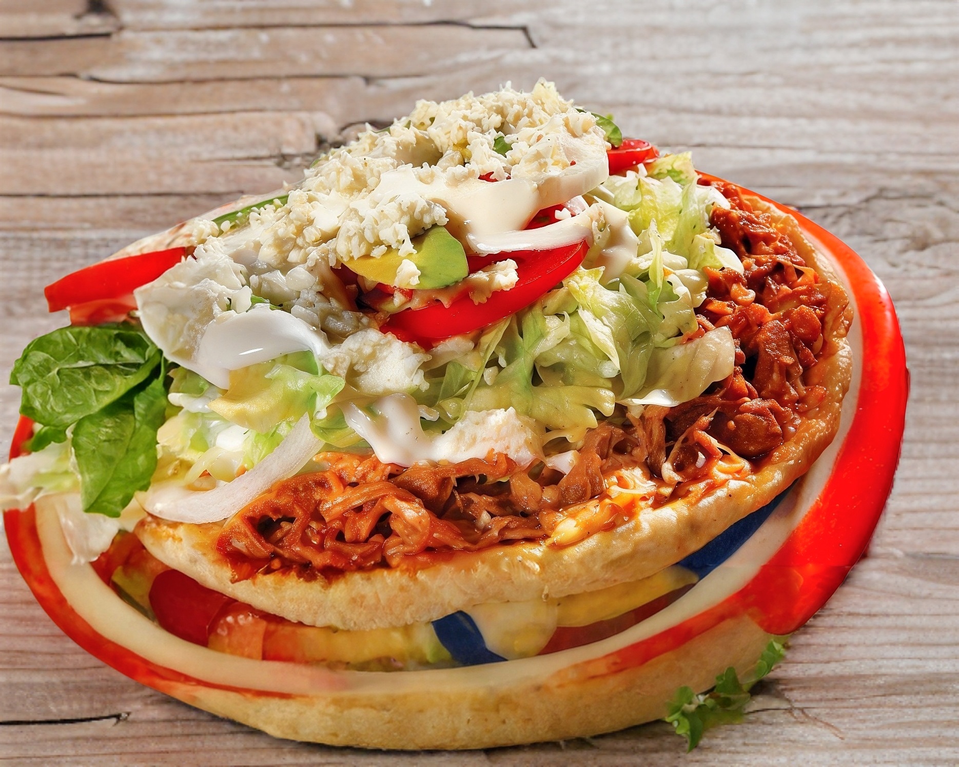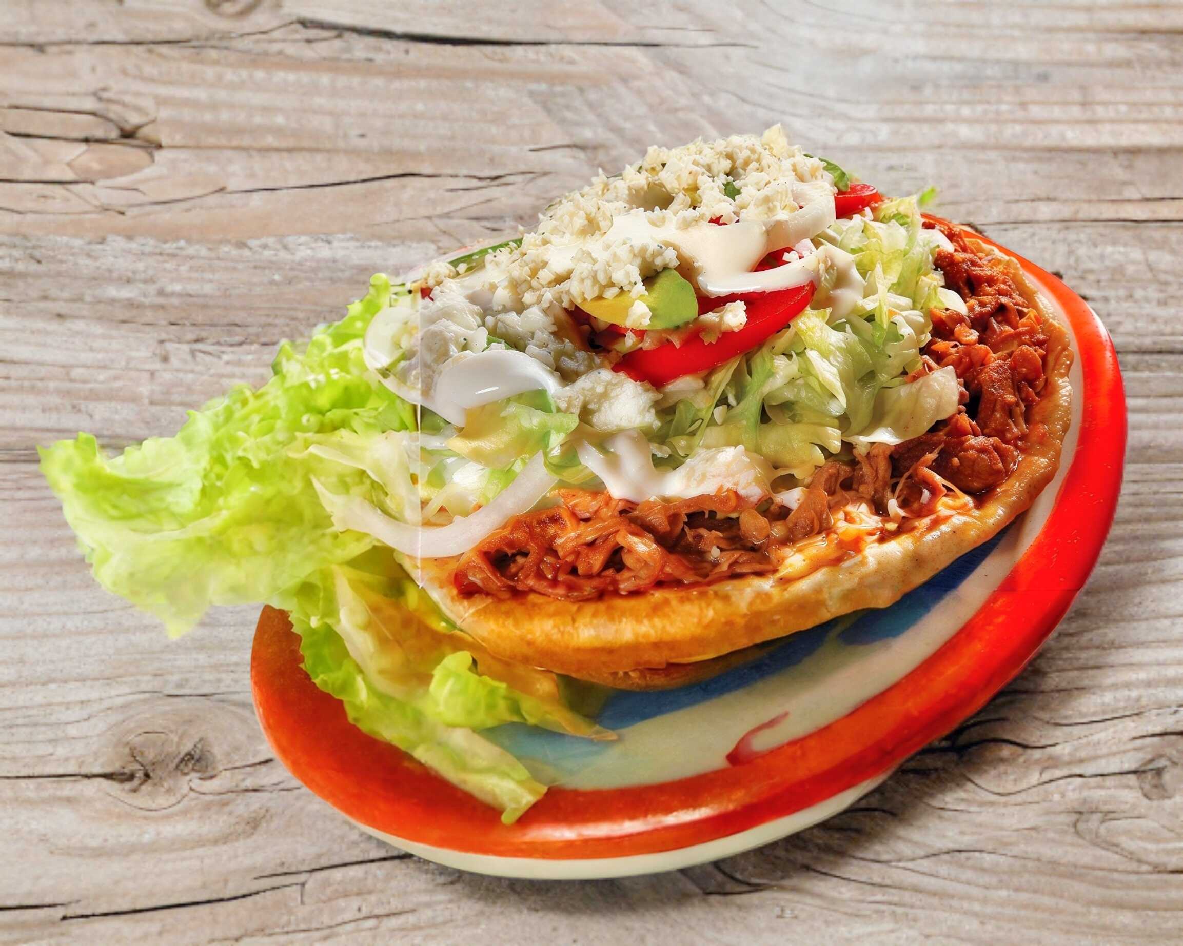 Frijoles refritos, lechuga, tomate, aguacate, crema y queso molido fresco.