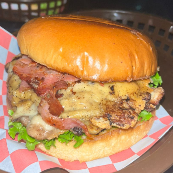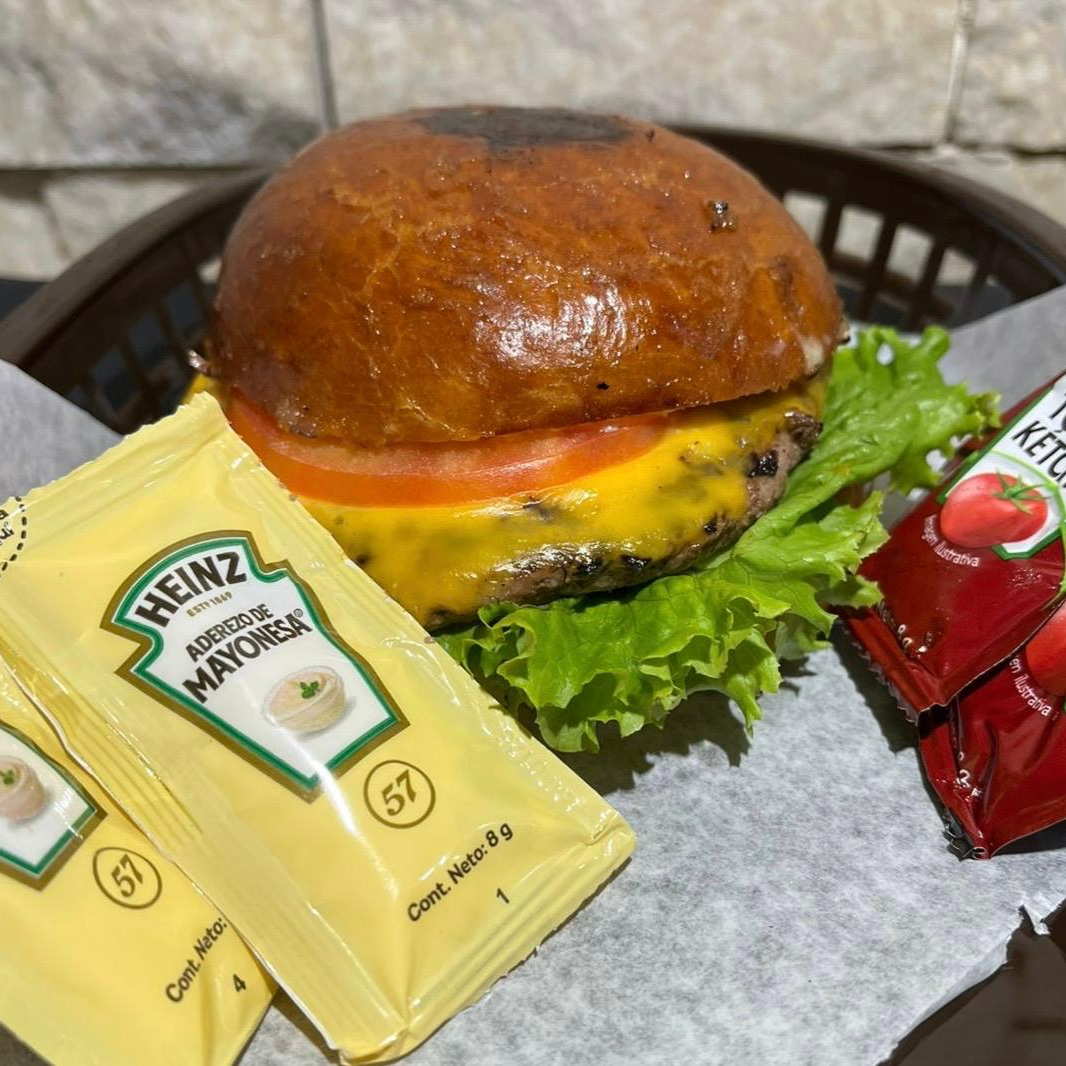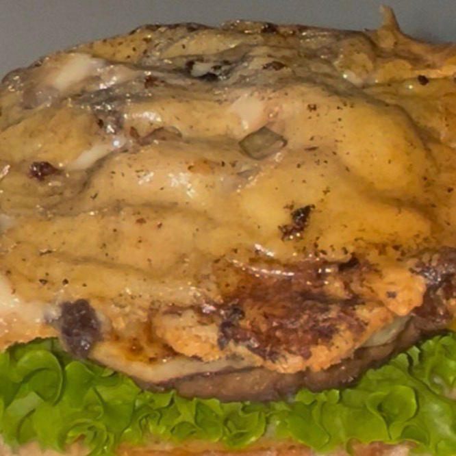 Pan Brioche / Hamburguesa .150 gr / Queso Americano / Champiñones / Costra Queso Mozzarella / Tocino / Lechuga
