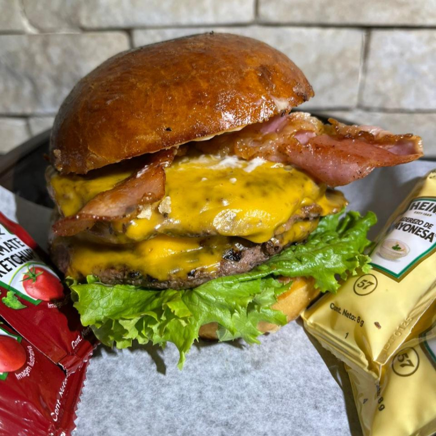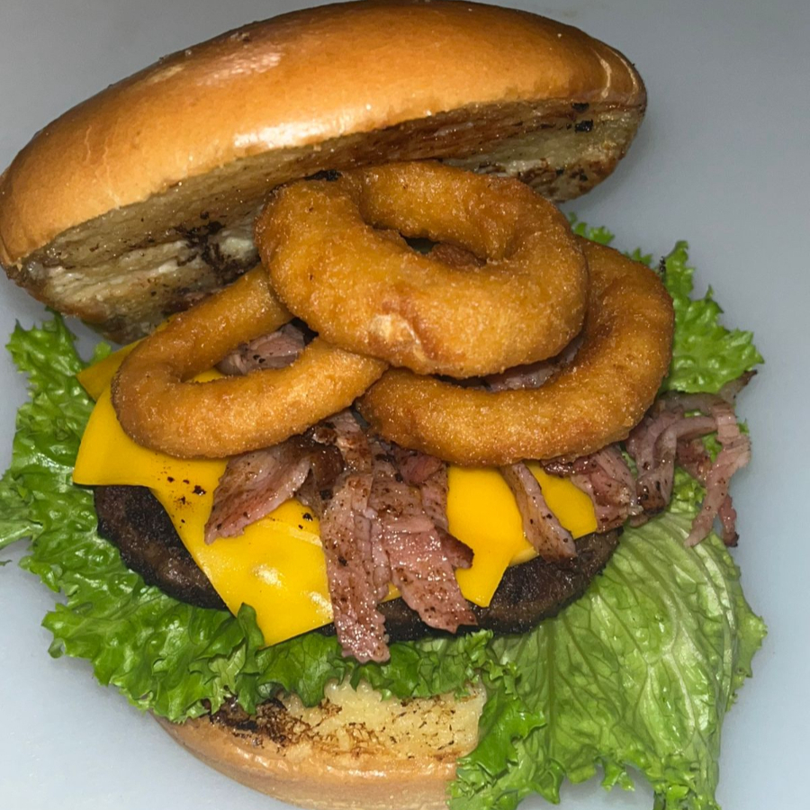 Pan Brioche / Hamburguesa .150 gr / Queso americano x2 / Tocino x2 / Aros de Cebolla 4 pzas/ lechuga