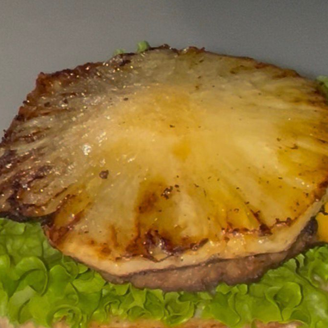 PAN BRIOCHE / HAMBURGUESA 150 GR / TOCINO / COSTRA DE QUESO MOZZARELLA / PIÑA / TOCINO