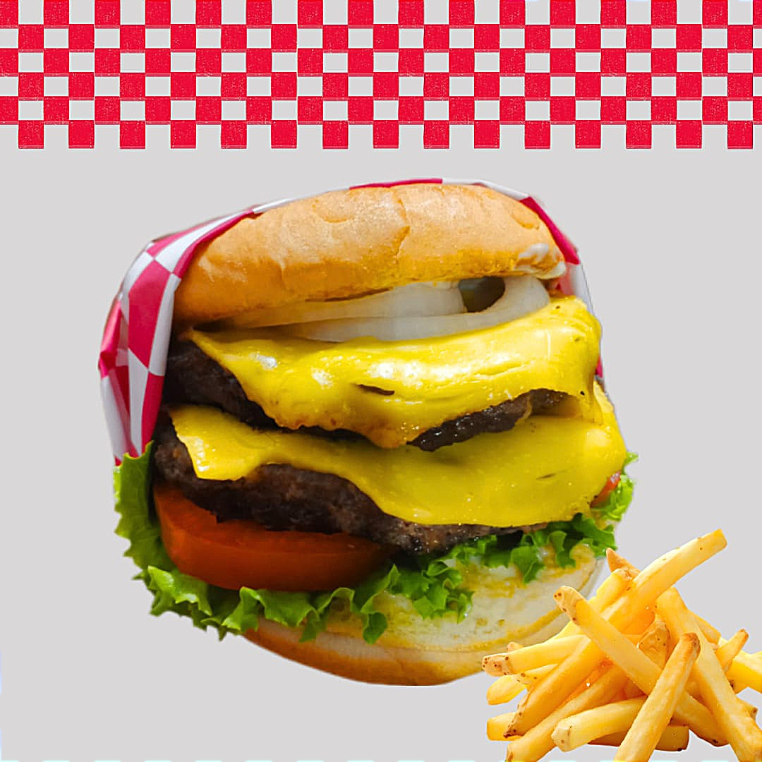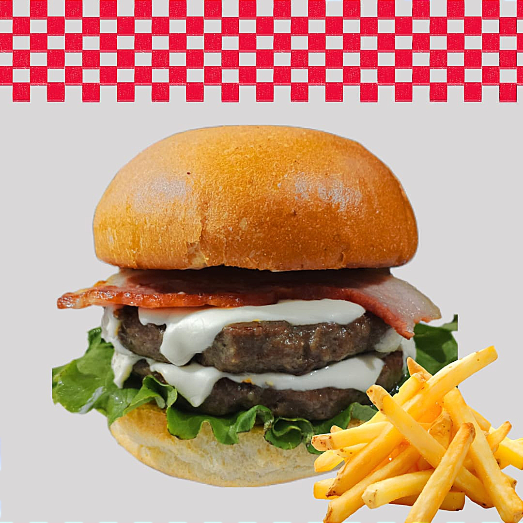 Doble carne de res, doble queso americano, tocino y aderezo de la casa, incluye papas fritas.