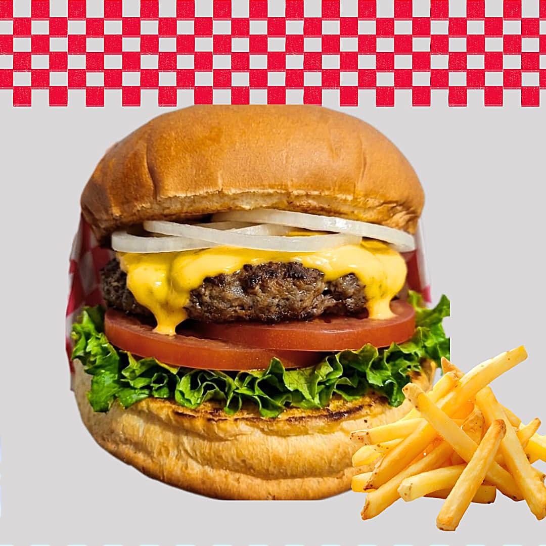 Pan brioche, carne de res, queso americano, lechuga italiana, tomate, cebolla y aderezo de la casa. Incluye papas fritas