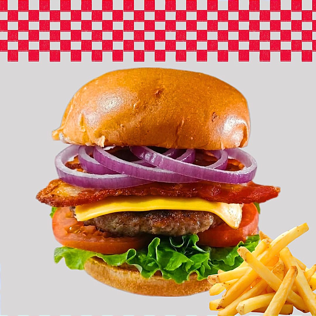 Pan brioche,Carne de res, tocino, queso americano, lechuga italiana, cebolla, tomate y aderezo de la casa. Incluye papas fritas