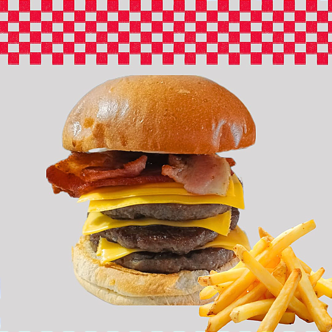 Pan brioche, Triple carne de res, triple queso americano, tocino y aderezo de la casa. Incluye papas fritas.