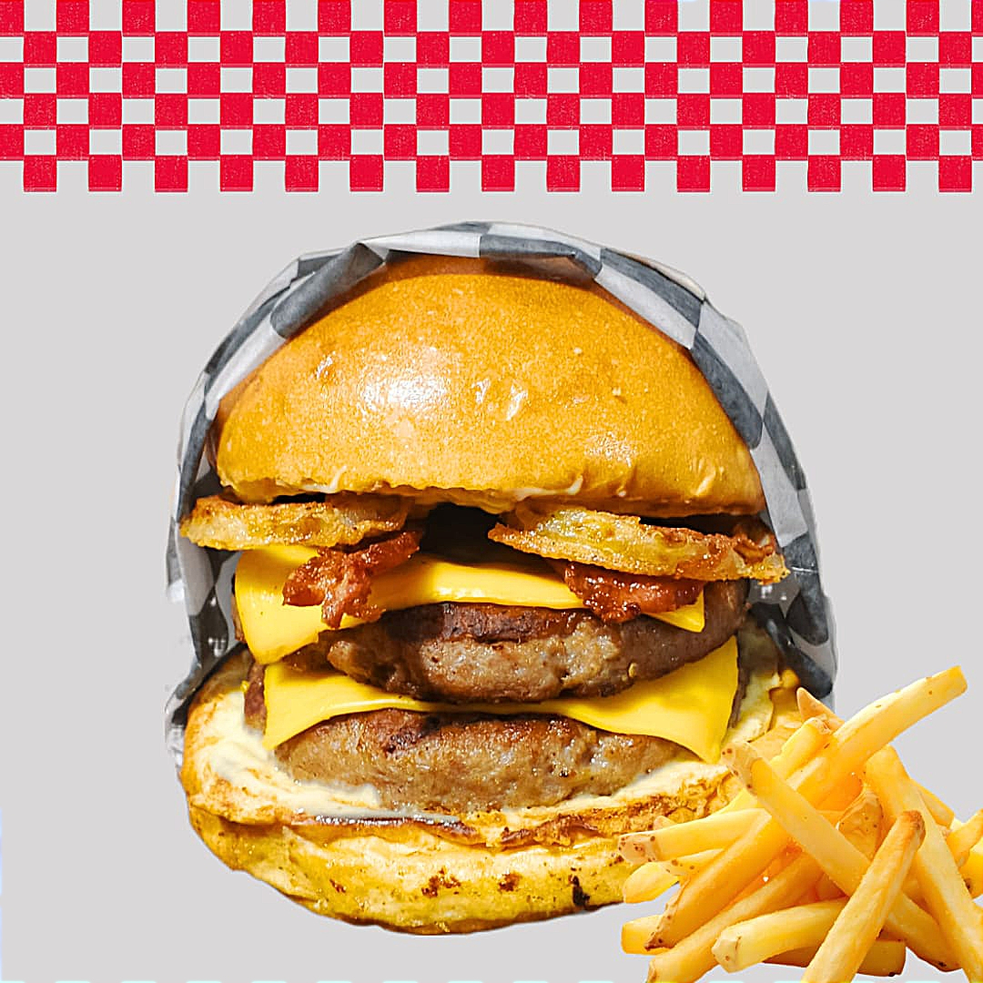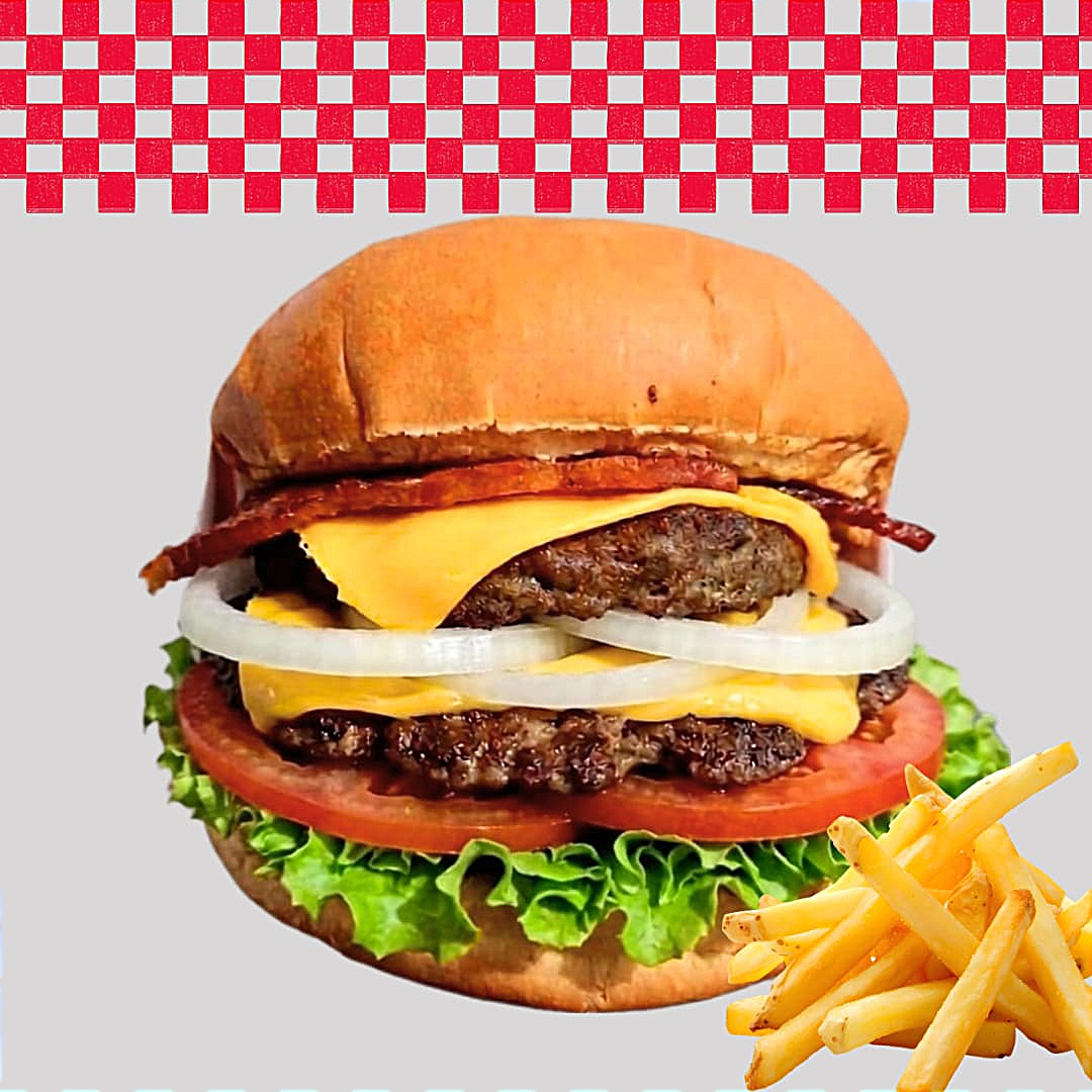 Doble carne 100% res, doble queso Americano, tocino, aros de cebolla y aderezo de la casa. Incluye papas fritas.