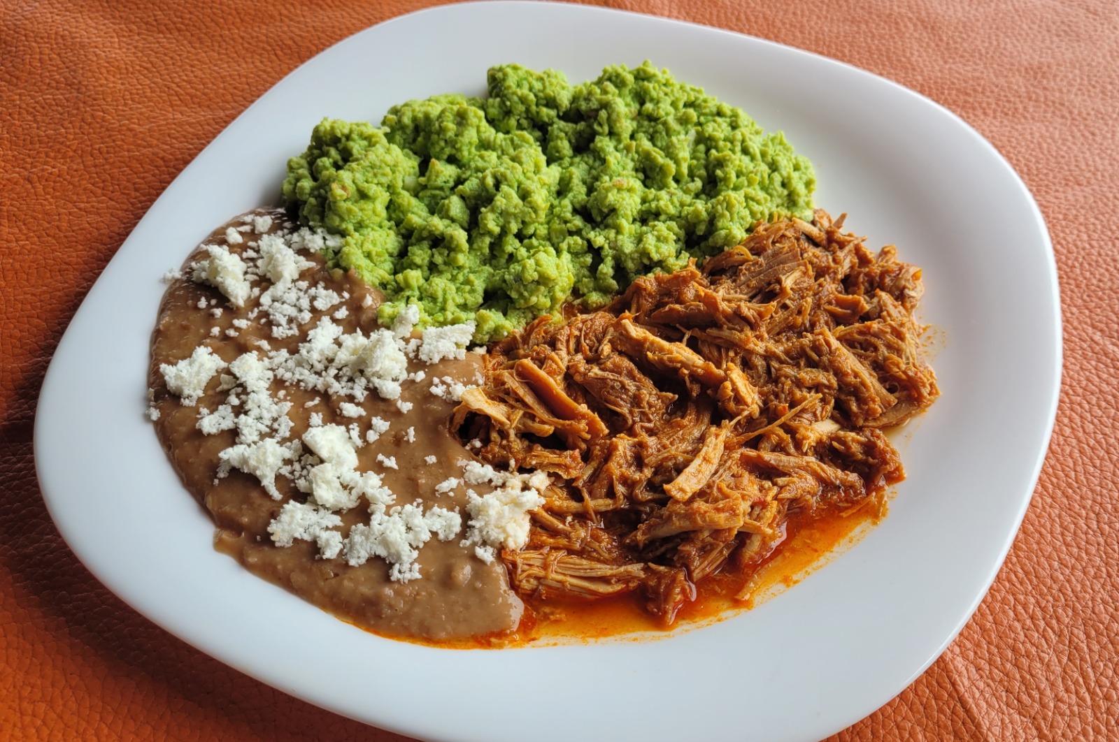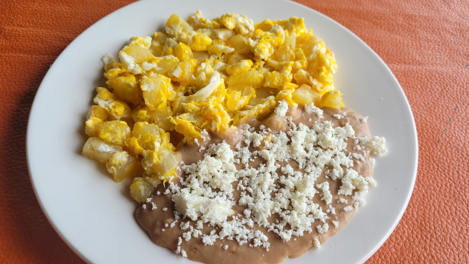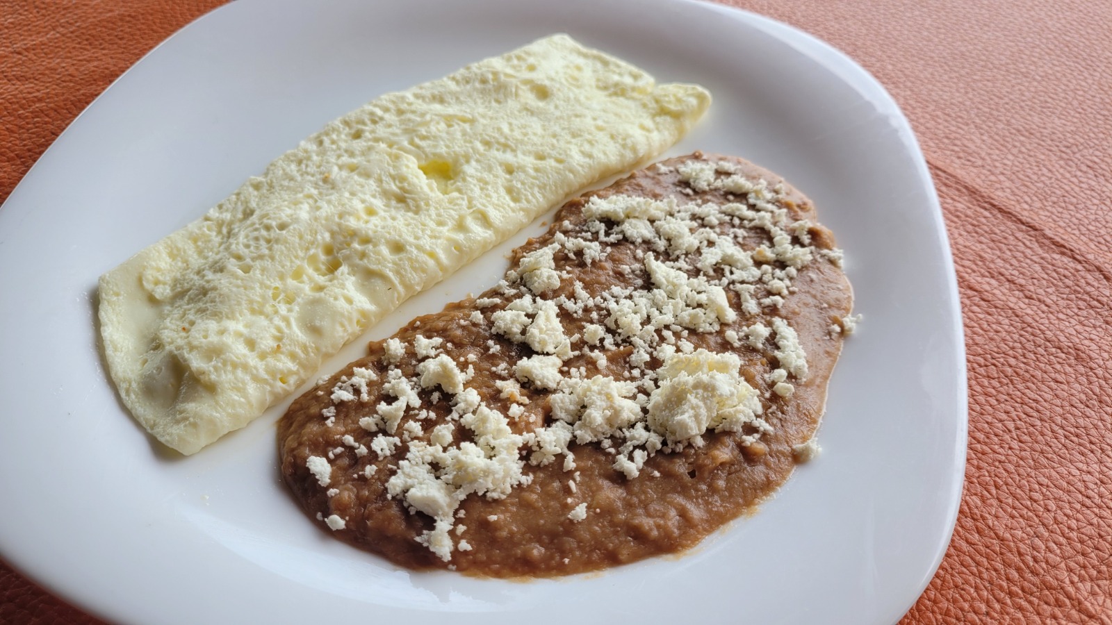 Relleno de jamón y queso asadero. Acompañado de frijolitos con queso. Incluye tortillas