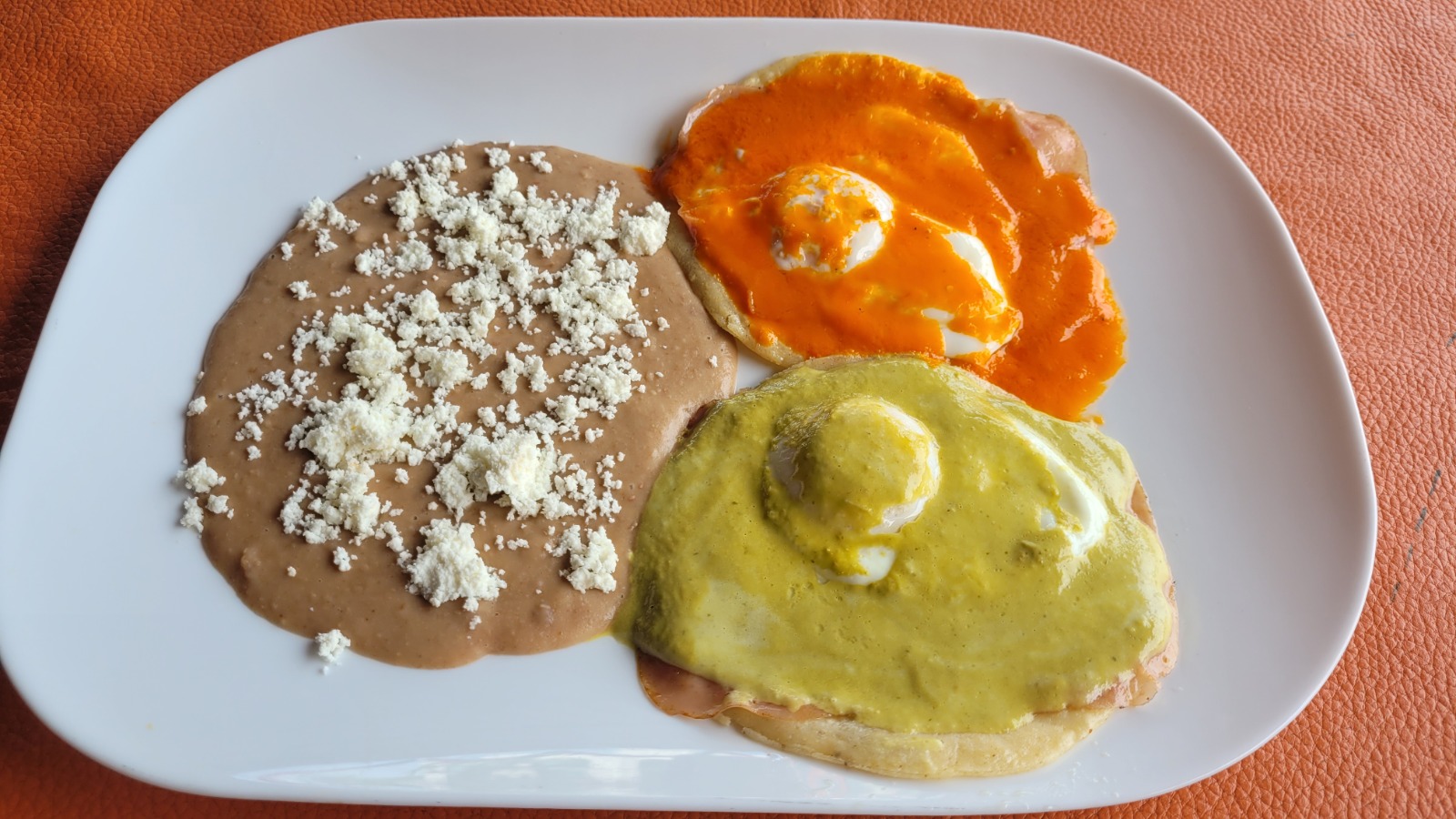 4 Tortillas de Maiz recien hechas, bañadas en salsa y rellenas de queso. Acompañadas de frijolitos, queso, crema y aguacate.