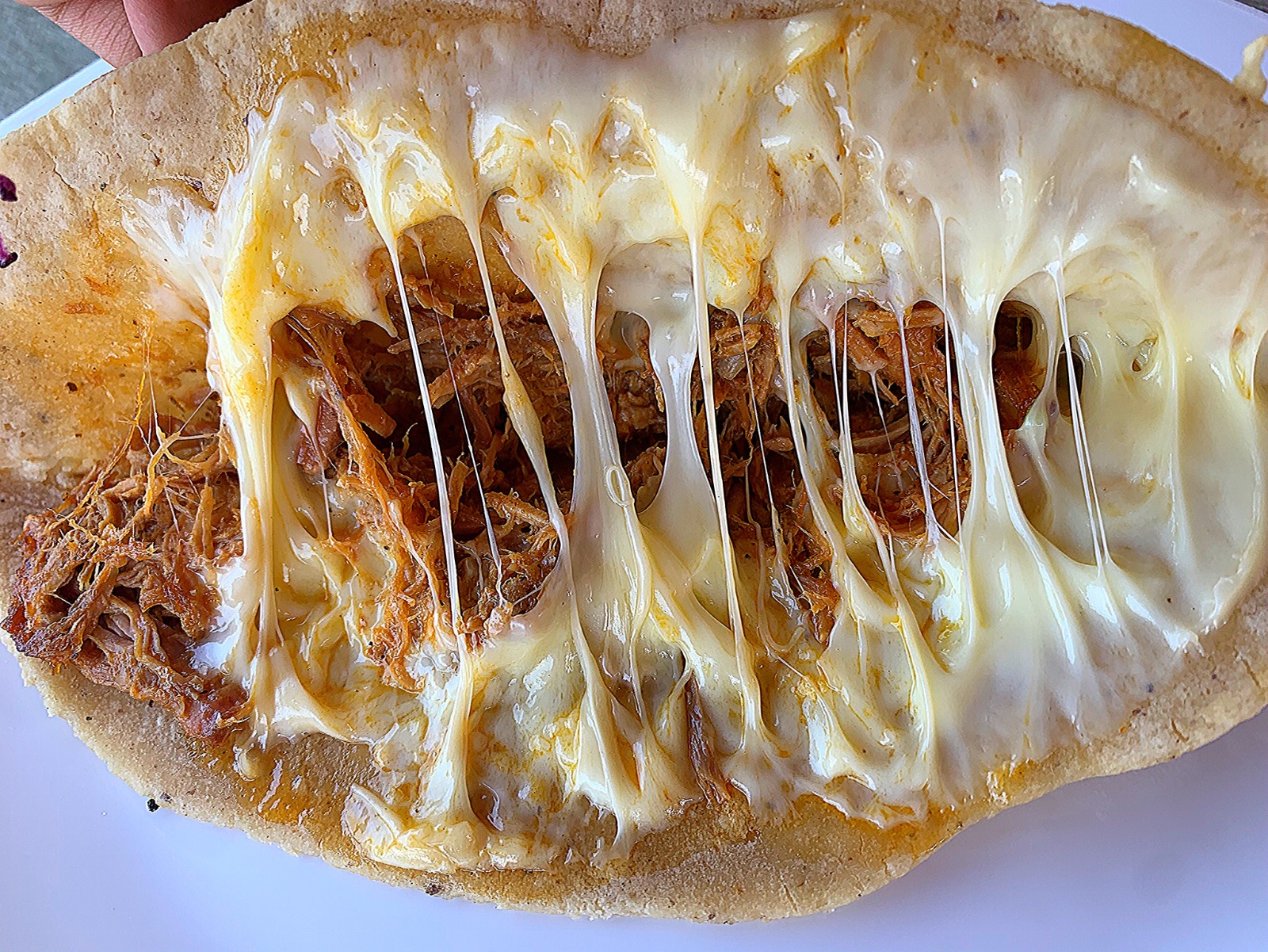Delicioso pan untado con frijoles refritos, jamón, queso blanco, queso amarillo, carne deshebrada chorixo, agucate, tomate y cebolla. Acompañada con su tradicional salsa de chicharrón