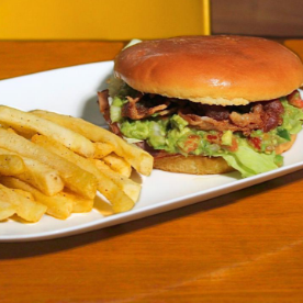 Elaborada con delicioso Pan Brioche. Con queso amarillo, queso asadero, jamón, guacamole, tocino, lechuga, tomate y cebolla
