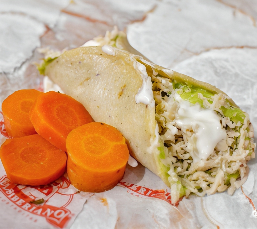 Taco de maiz, con guacamole, crema y pechuga de pollo.