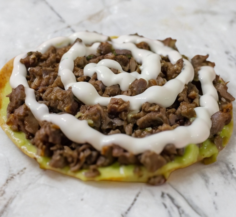 Tostada de maiz frita, con guacamole, crema y arrachera picada.