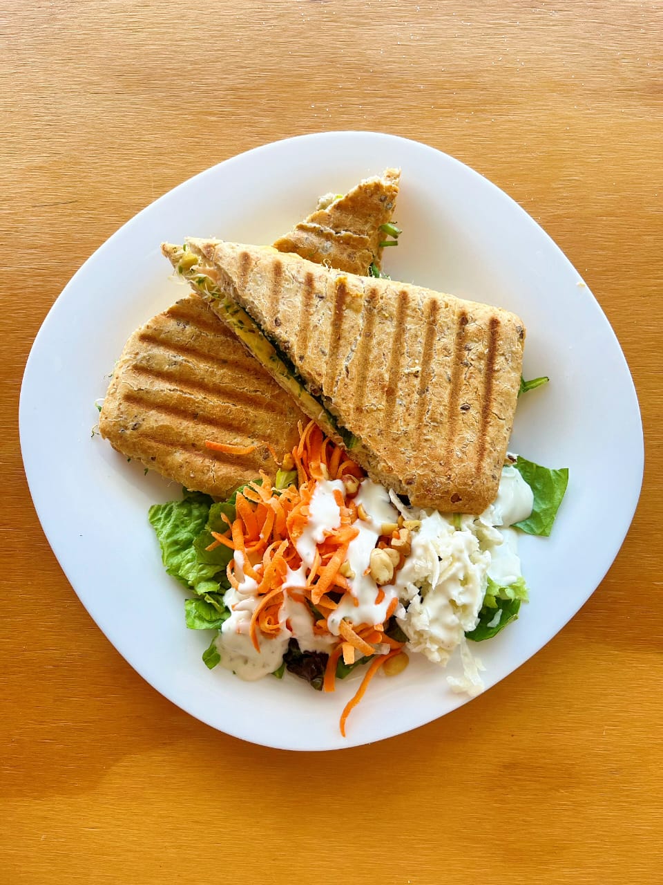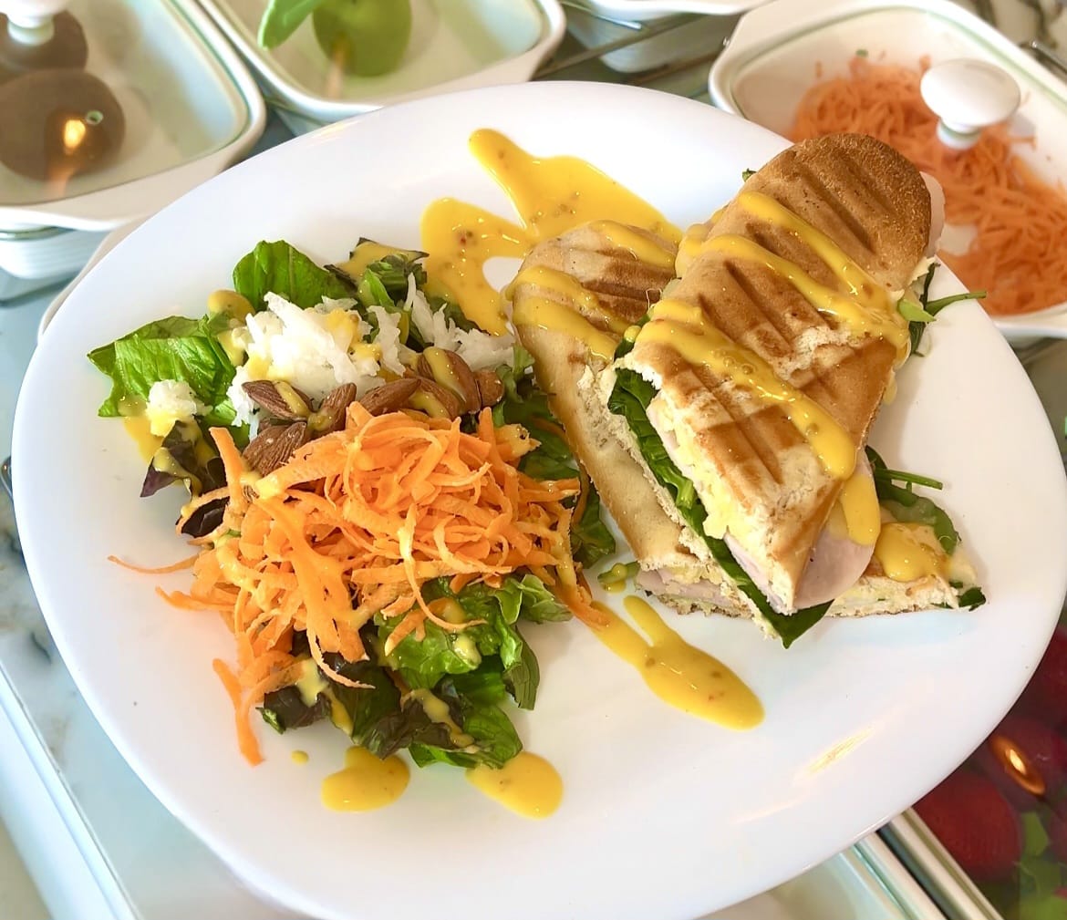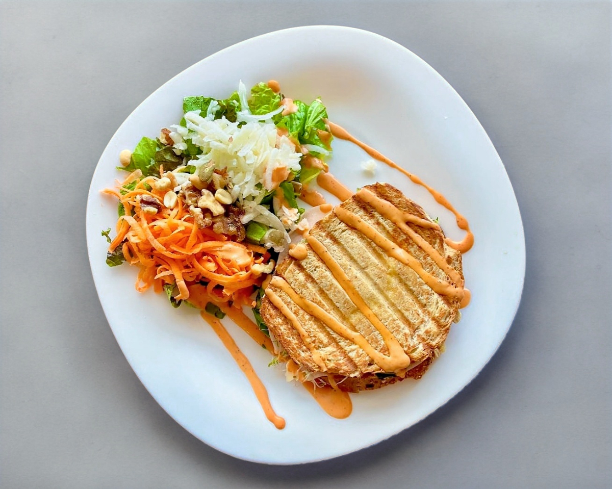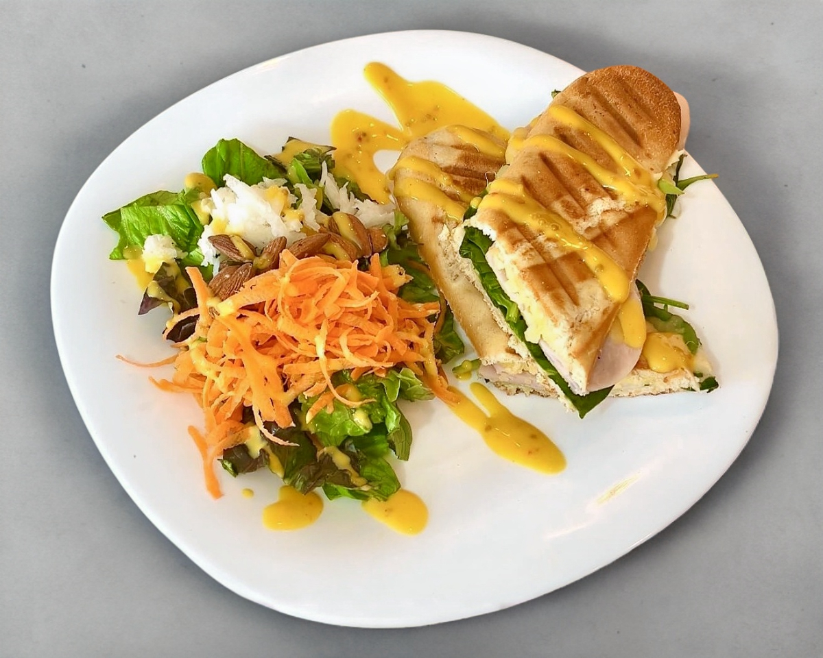 Crujiente y delicioso, pechuga de pavo, queso manchego, mostaza, cebolla caramelizada, espinacas y aderezo de la casa.