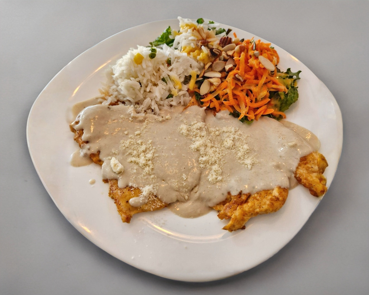 Pechuga marinada a la plancha, marinada en una rica salsa de champiñones, acompañada de arroz blanco o arroz coliflor, rica ensalada y crema del día.