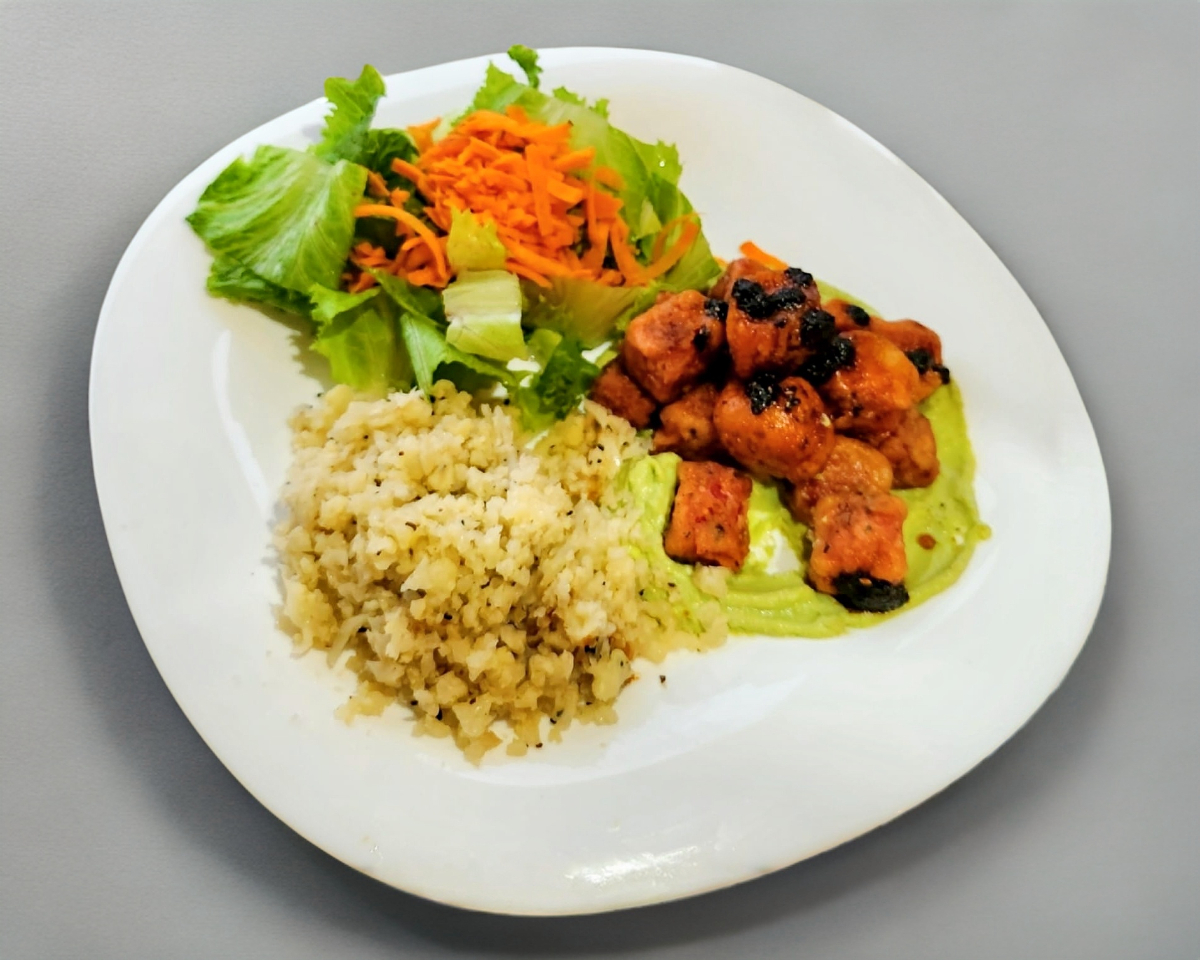 Exquisitos trozos de atún marinado, en una deliciosa cama de aguacate acompañados de porción de arroz blanco o arroz de coliflor, rica ensalada y crema del día.