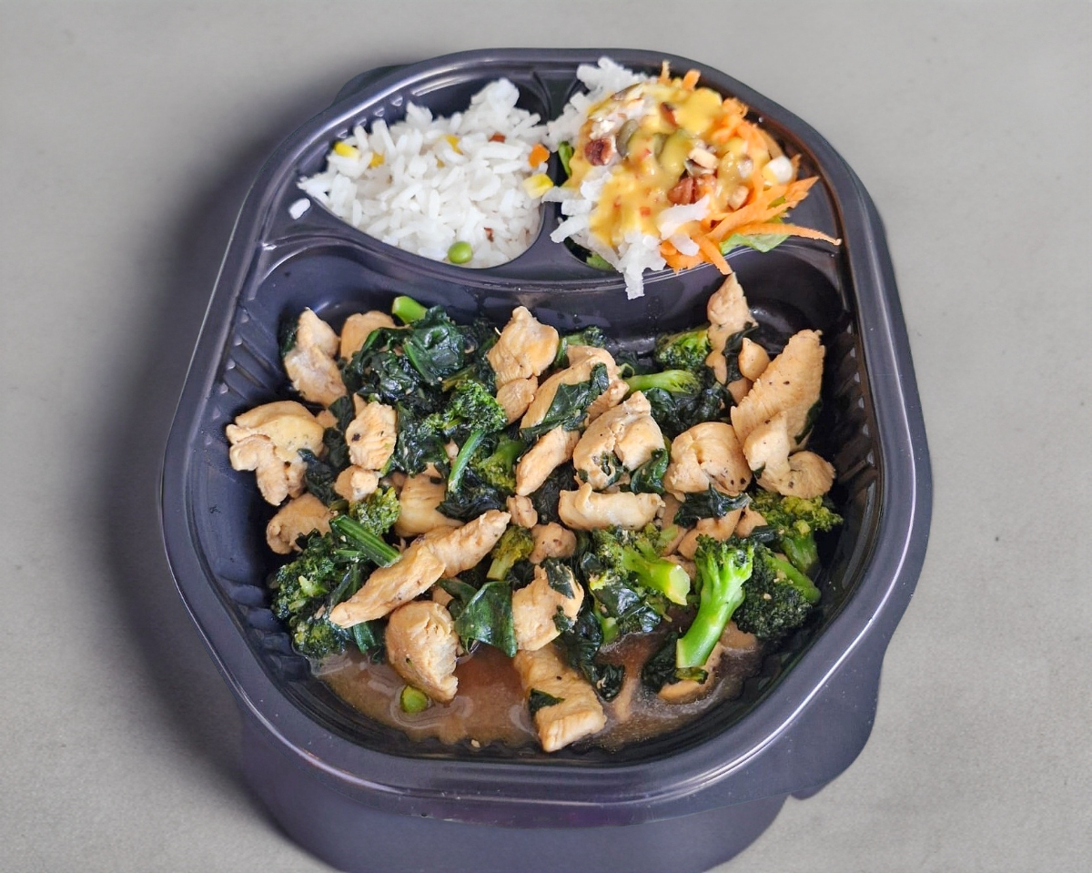 Deliciosos cubos de pollo a la plancha en salsa de soya, con brócoli y espinacas, acompañado de arroz blanco o arroz blanco.