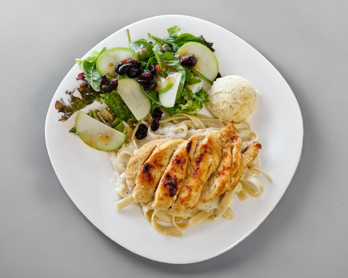 Deliciosa pasta bañada en salsa alfredo acompañada de puré de papa, ensalada de manzana, arándanos y crema del día.