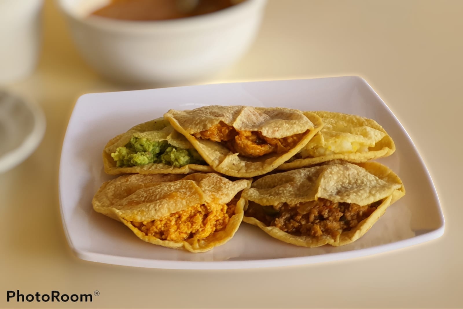 Lleva de base papa y frijol y un guiso más(picadillo, chorizo,h rojo ,h verde,)
