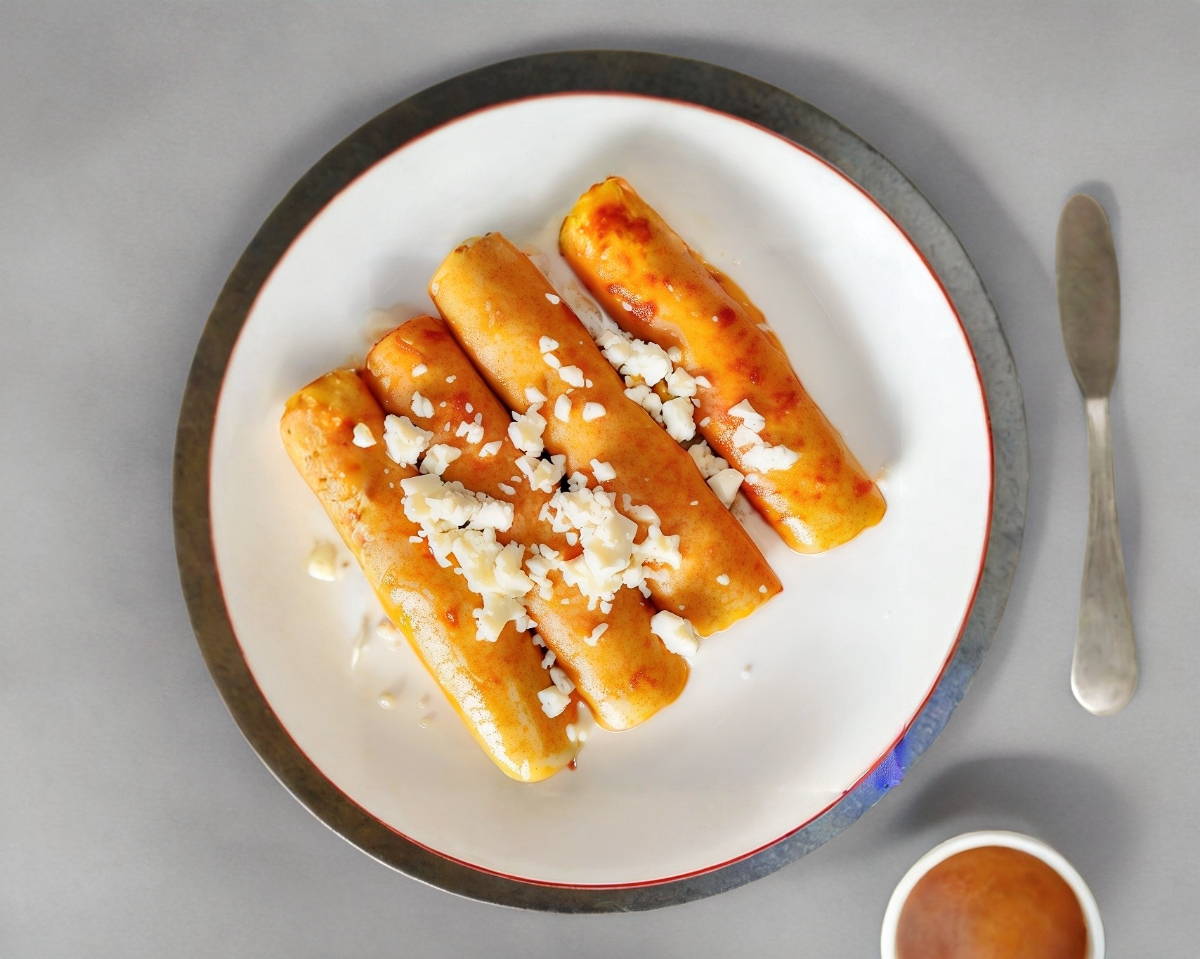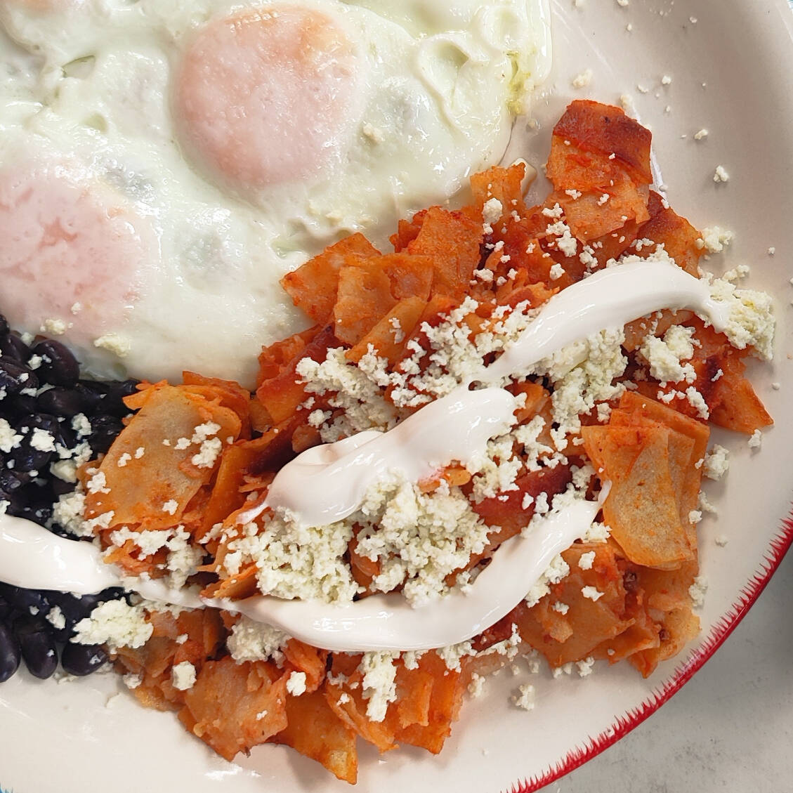 chilaquiles rojos, 2 huevos, frijoles y queso