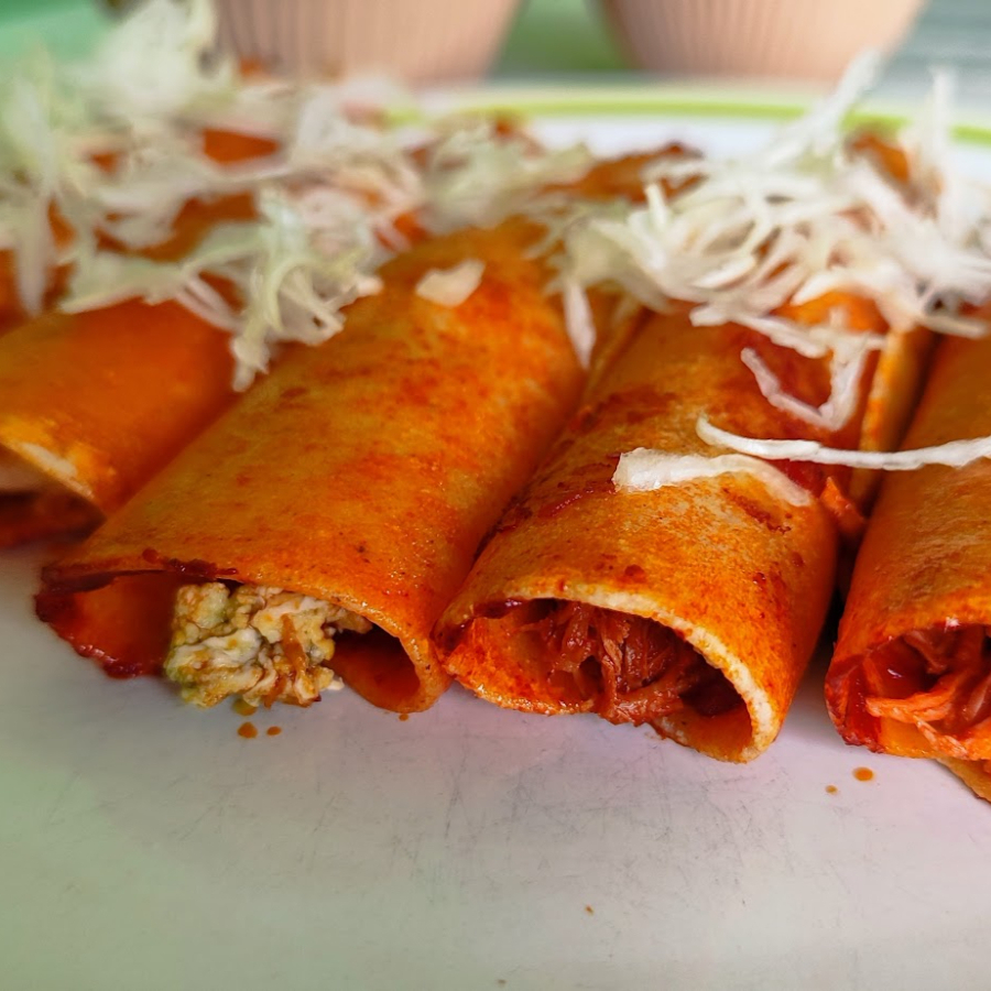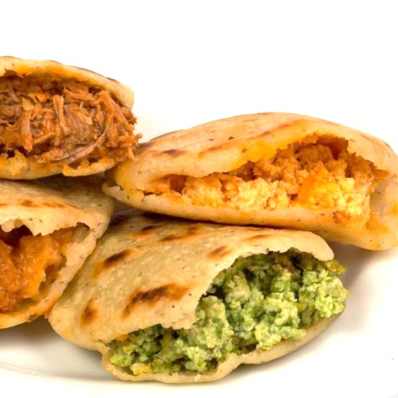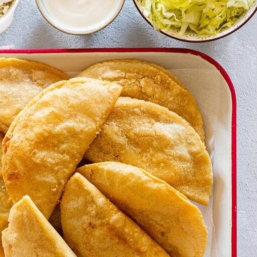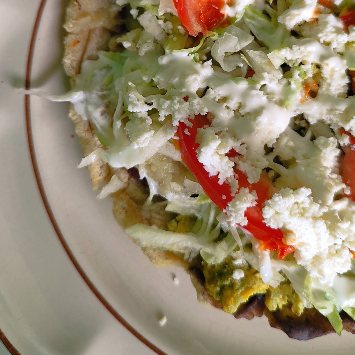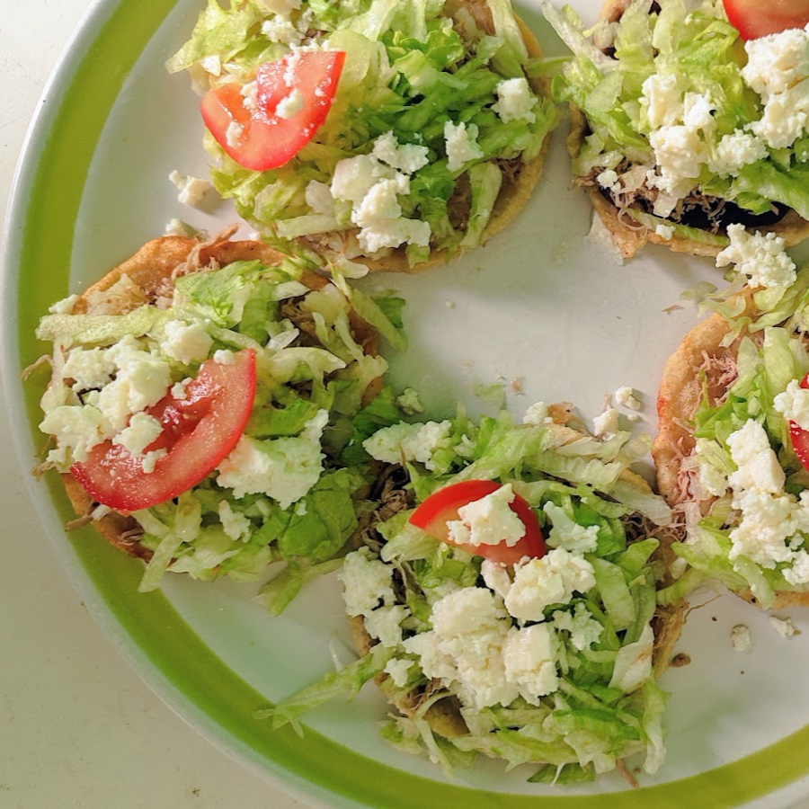 5 pzs base frijol, carne deshebrada, lechuga, tomate, cebolla, queso, crema
