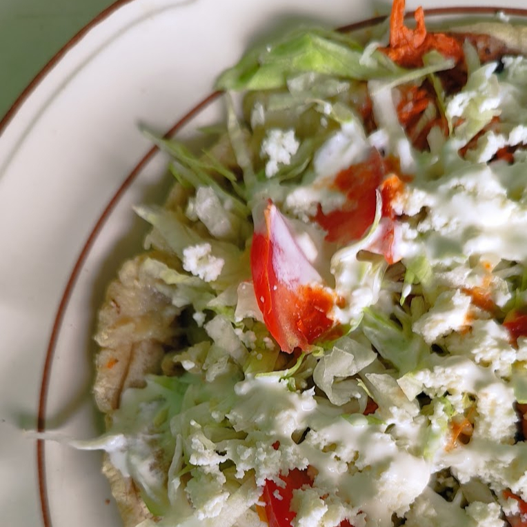 5 pzs base frijol, carne deshebrada, lechuga, tomate, cebolla, queso y crema