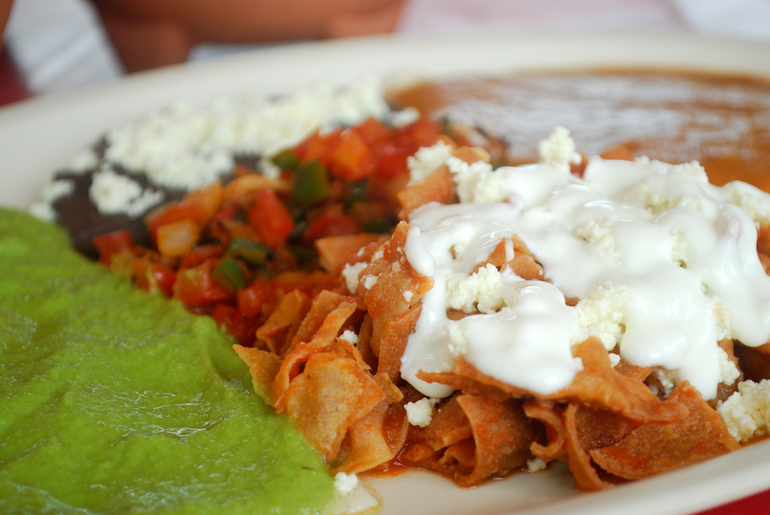 Huevos divoriciados, uno rojo, uno verde con pico de gallo, frijoles con queso y un poquito de chilaquiles rojos.