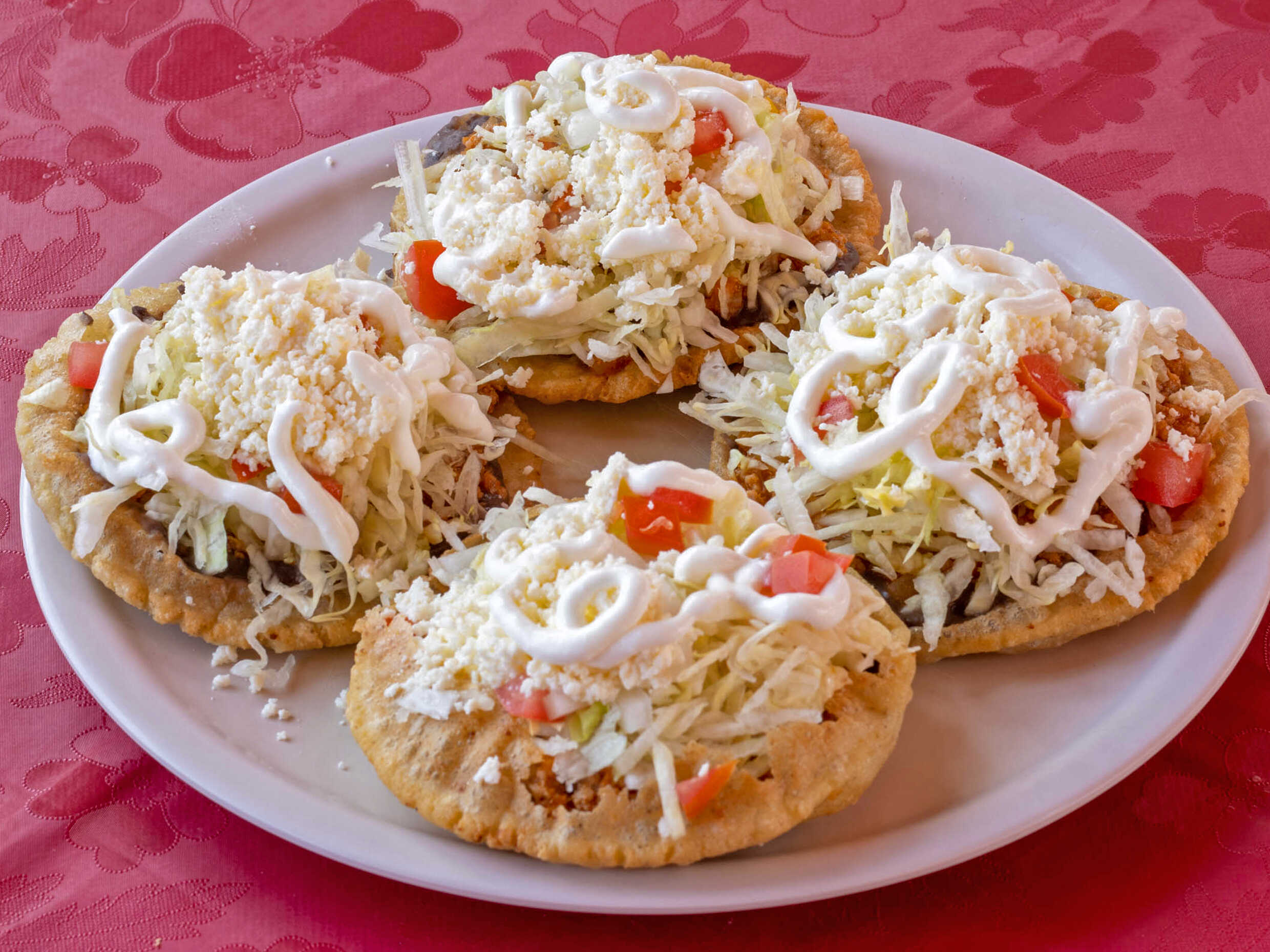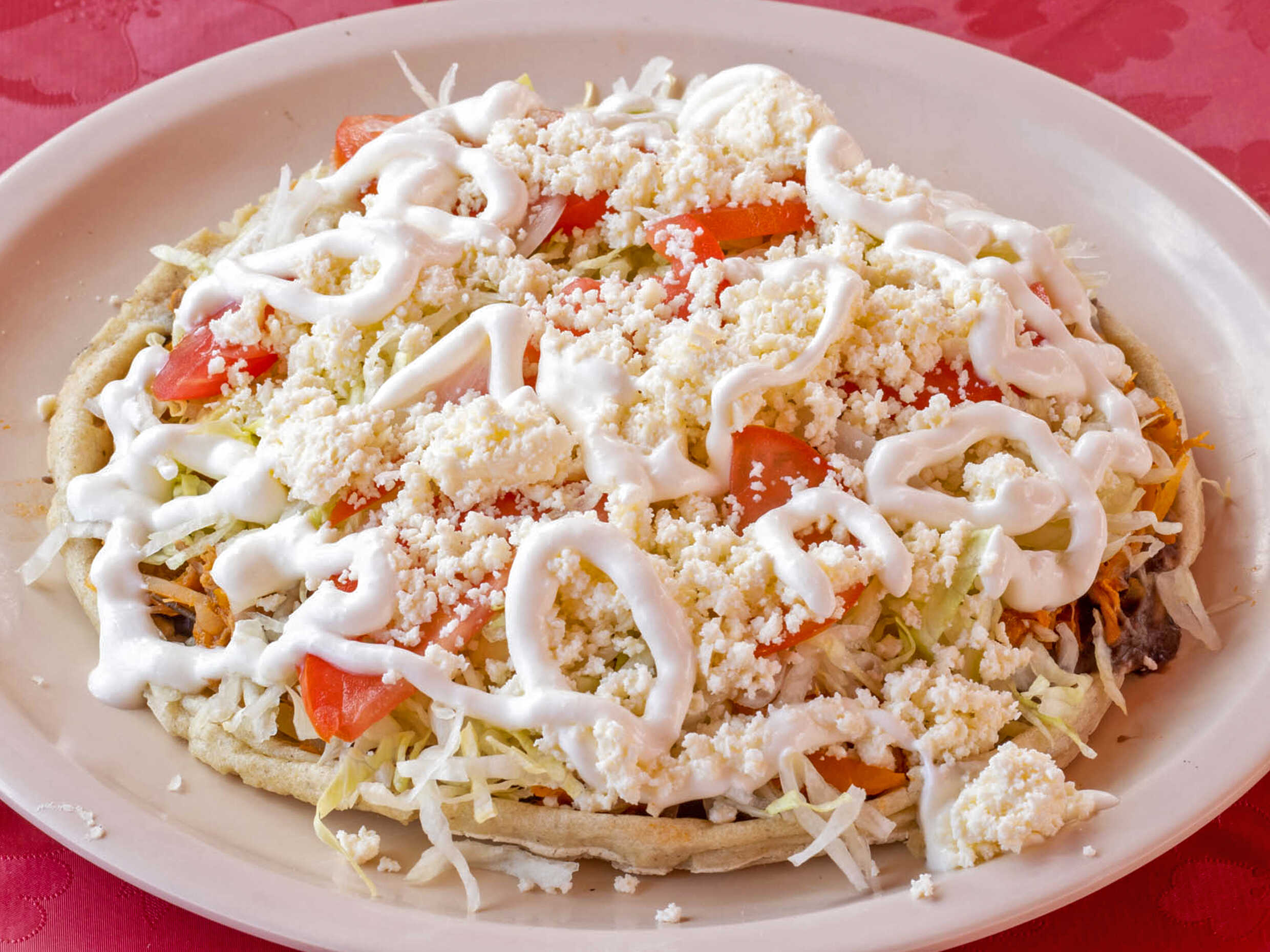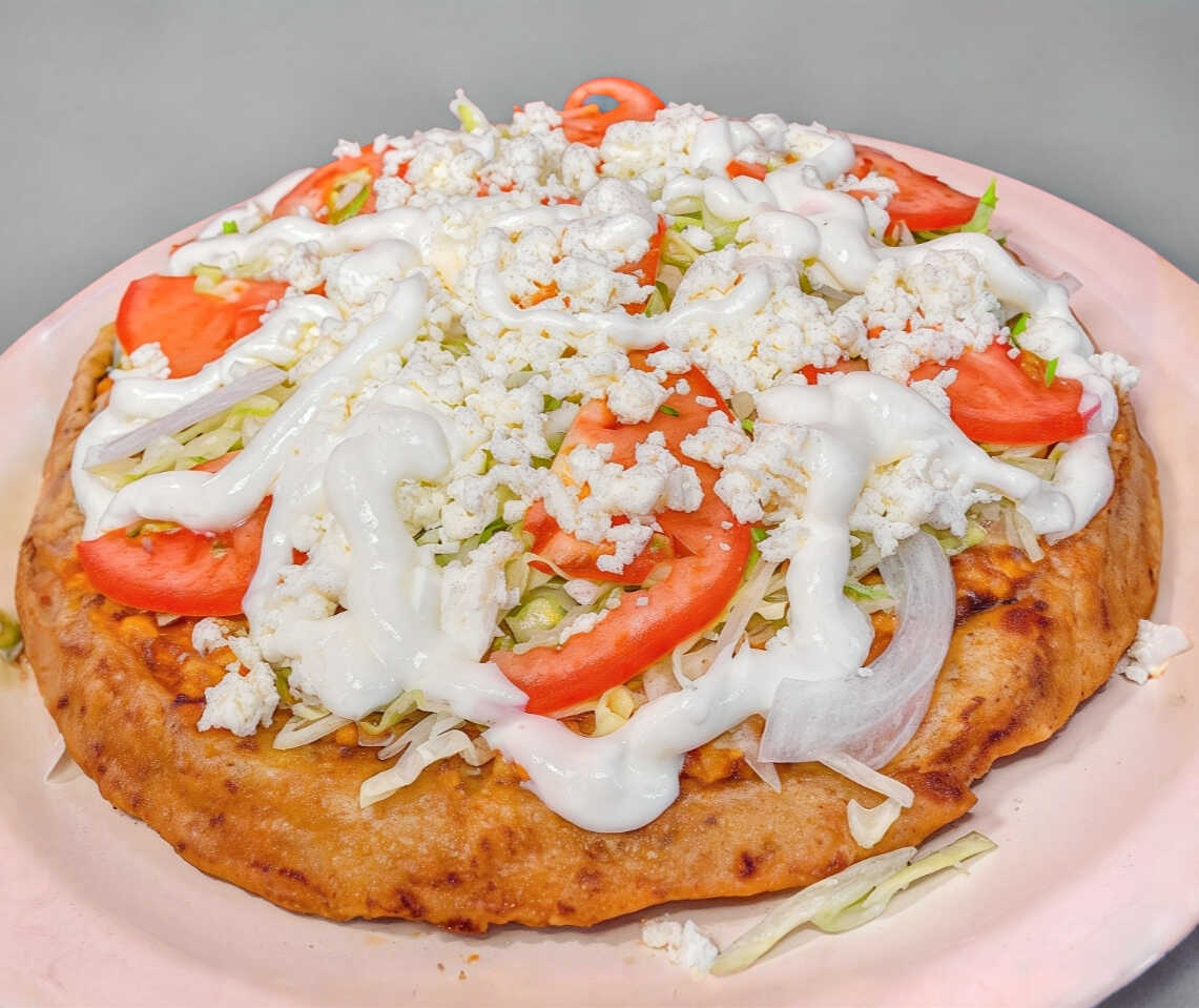 Una gran migada de nuestra deliciosa masa crujiente con base de frijol, los guisoa de tu guato, lechuga, tomate, cebolla, queso y crema.