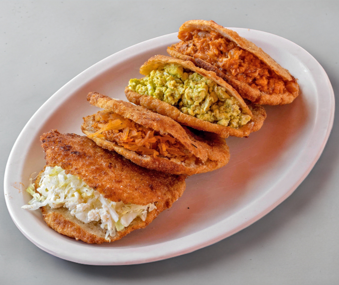 Una gordita frita de masa revuelta con chicharrón de cachete, incluye ensalada y frijoles. Rellena de guiso, puedes elegir entre 9 guisos que hay. Porción personal.