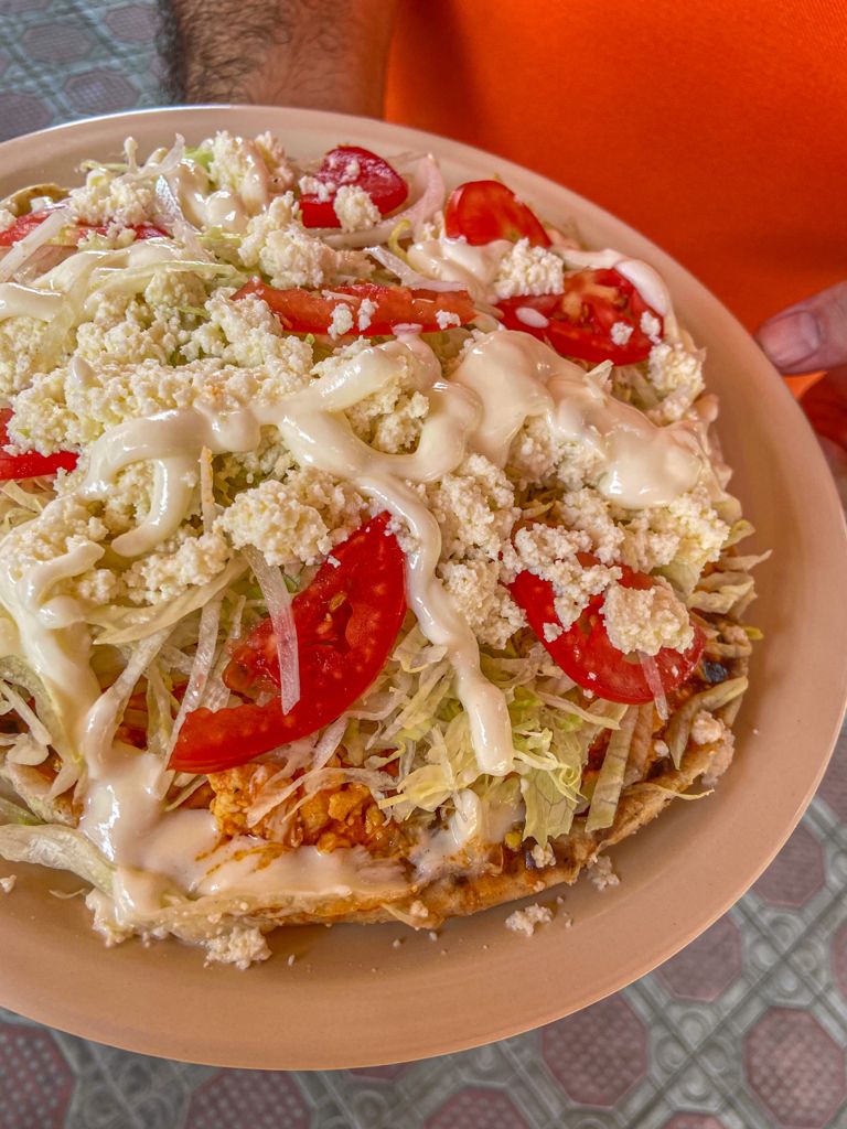 Migada con masa frita revuelta con chicharrón de cachete , base de frijol, cebolla, lechuga, queso , crema y el guiso de tu elección.