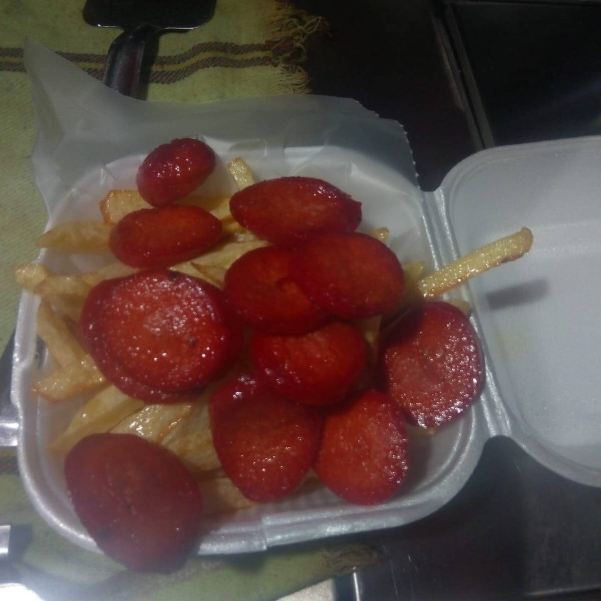 Papas fritas con salchichón aderezos aparte(catsup y chipomayo)