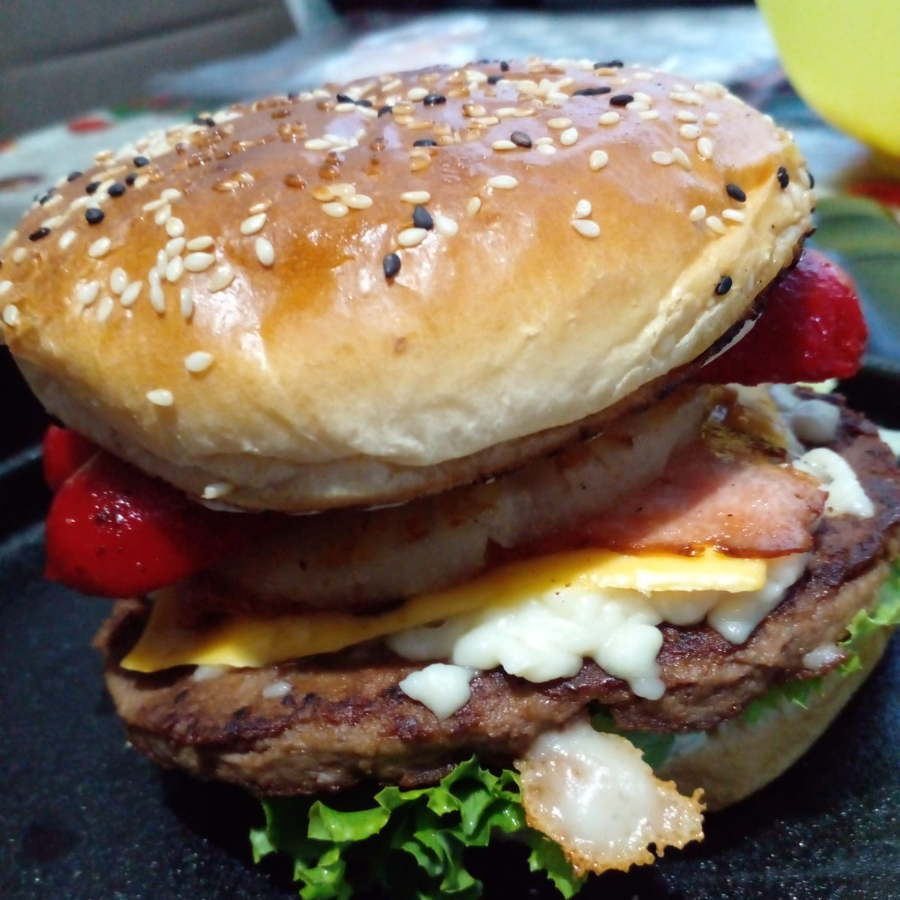 Carne jugosa de arrachera queso amarillo queso gouda vegetales frescos tocino incluye catsup chiles y chipomayo 😉