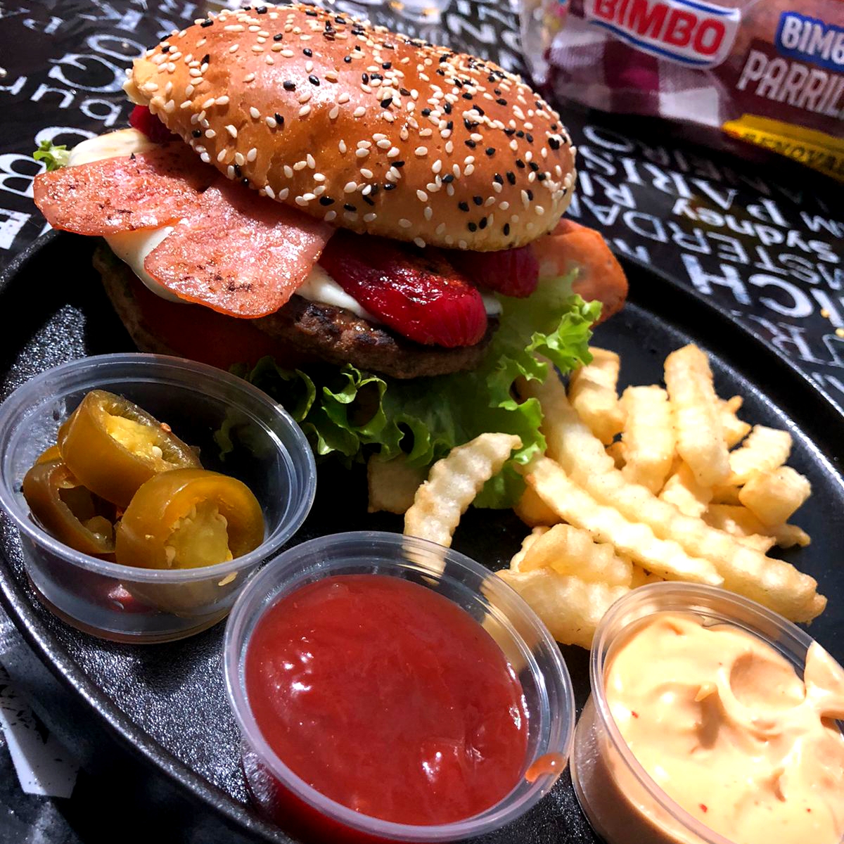 Carne jugosa de arrachera queso amarillo queso gouda tocino vegetales frescos salchichón incluye papas fritas chiles catsup y chipomayo 😉
