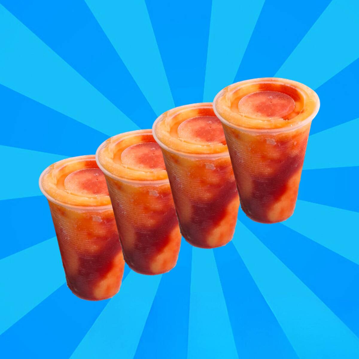4 vasos grandes de granita de pulpa de mango fresco, chamoy y miguelito .