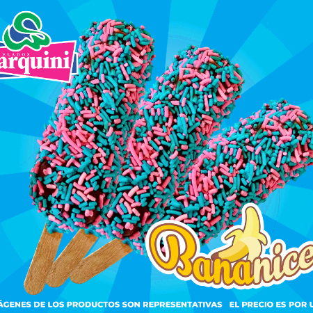 Paleta cremosa de leche con pulpa natural de plátano, bañada en chocolate y chispas multicolores.