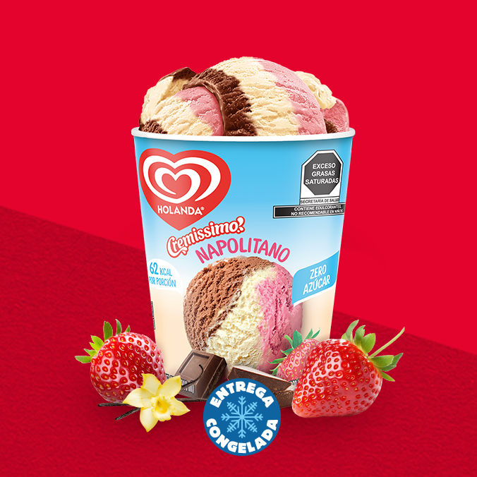 Helado de grasa vegetal sin azúcar estilo napolitano con sabores de fresa, vainilla y chocolate. Perfecto para cuidar tu figura sin renunciar al sabor. Contenido: 900ml.